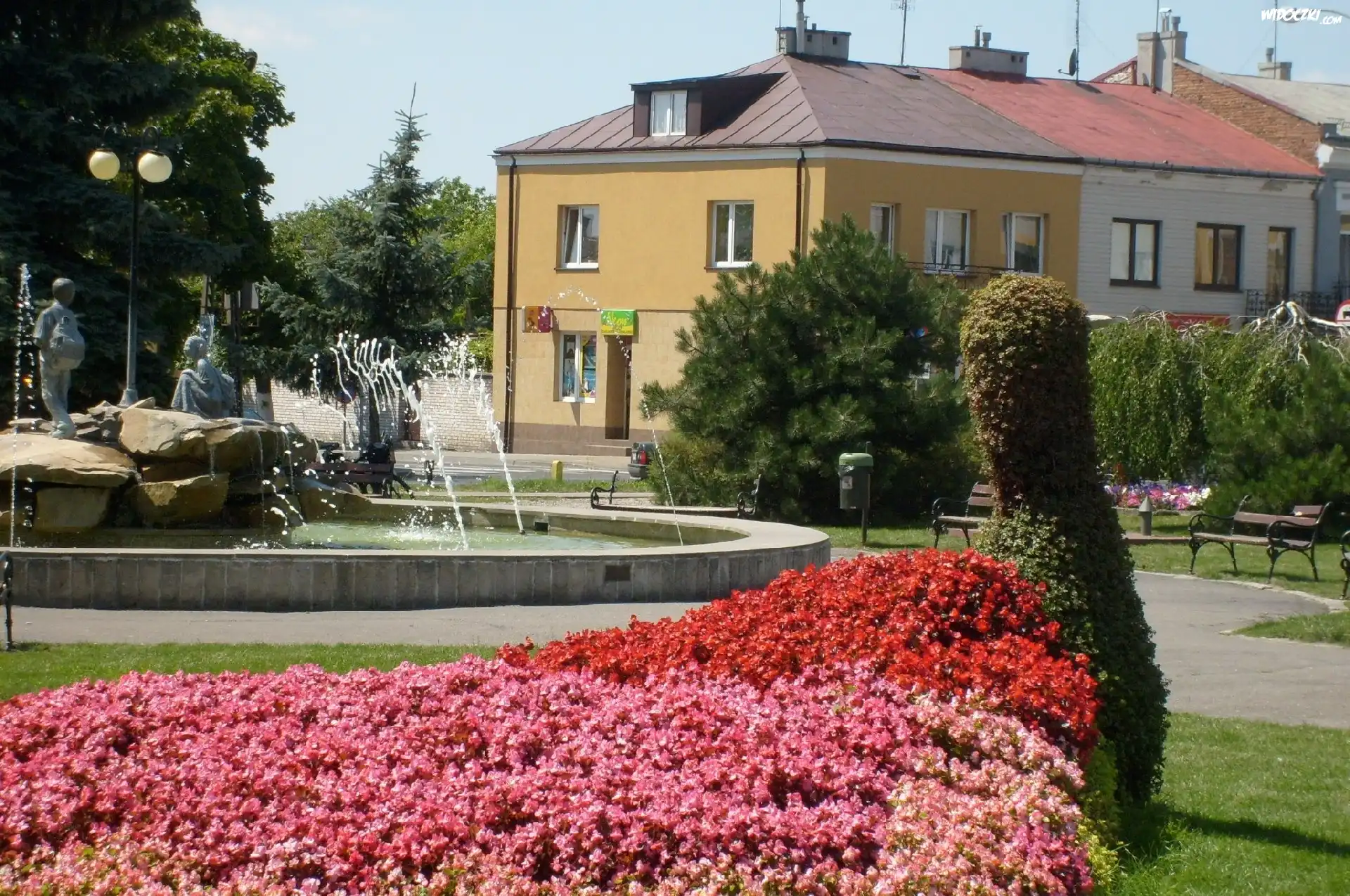 Zdjęcia, Ptak, Kwiaty, Fontanna, Dom