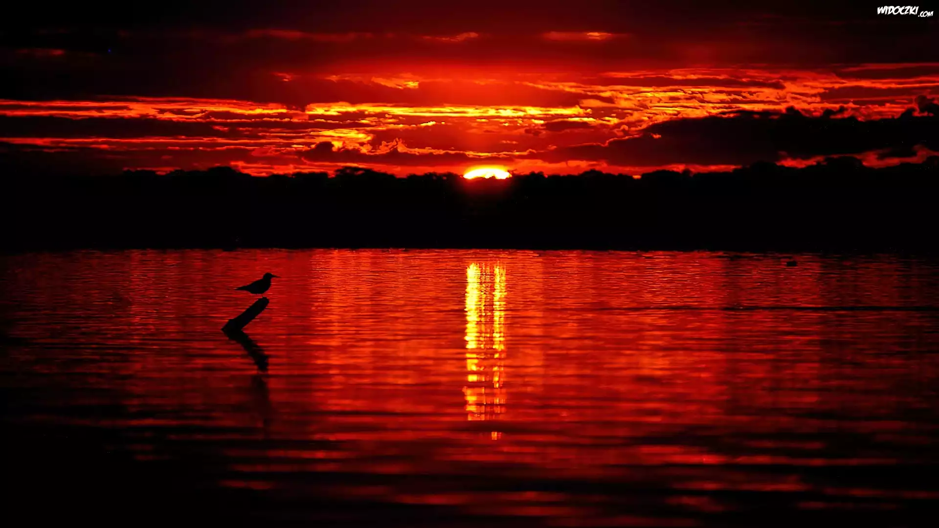 Zdjęcia, Ptak, Zachód, Słońca, Jezioro