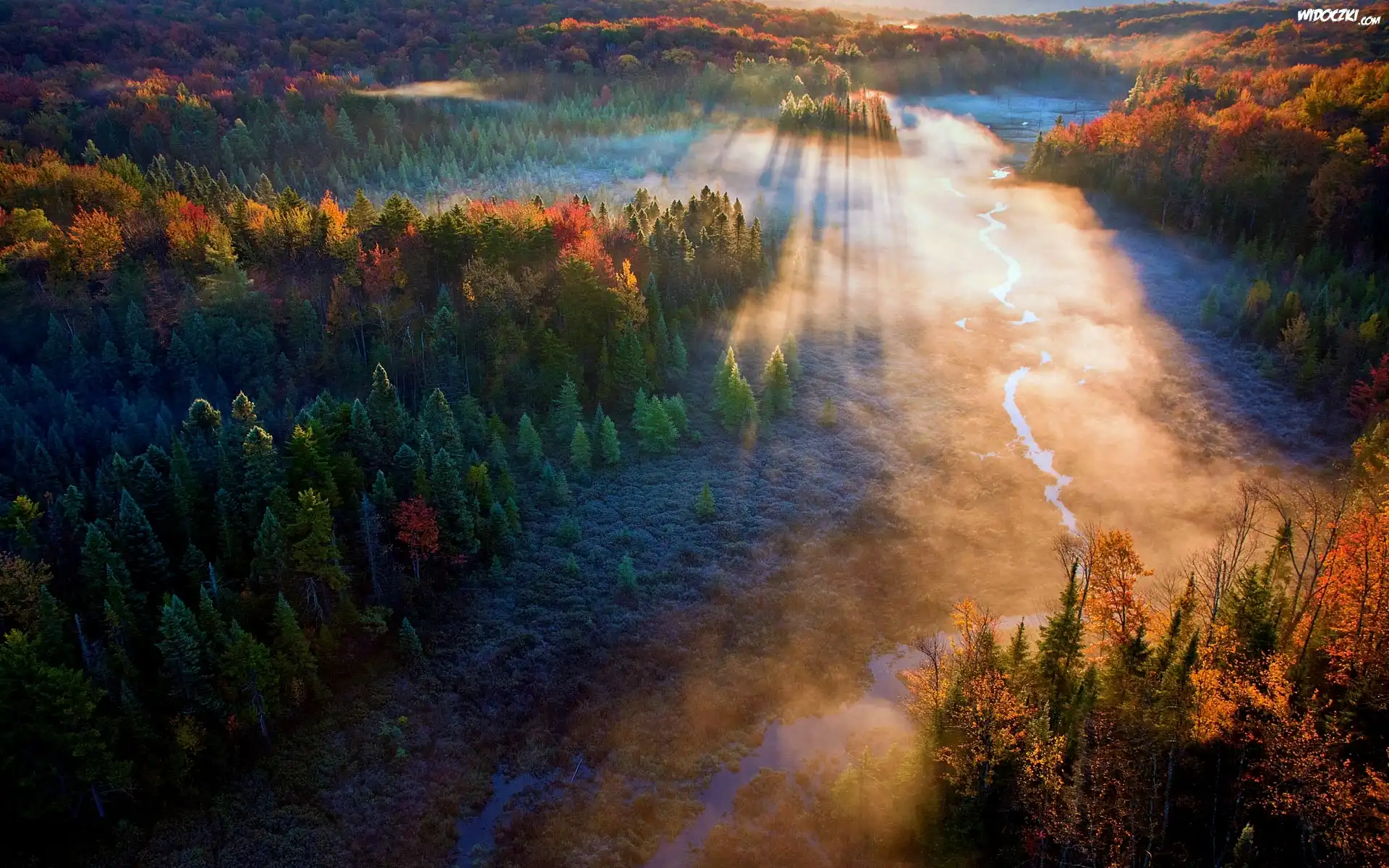 Jesień, Las, Rzeka, Mgła, Promienie Słońca, Z Lotu Ptaka