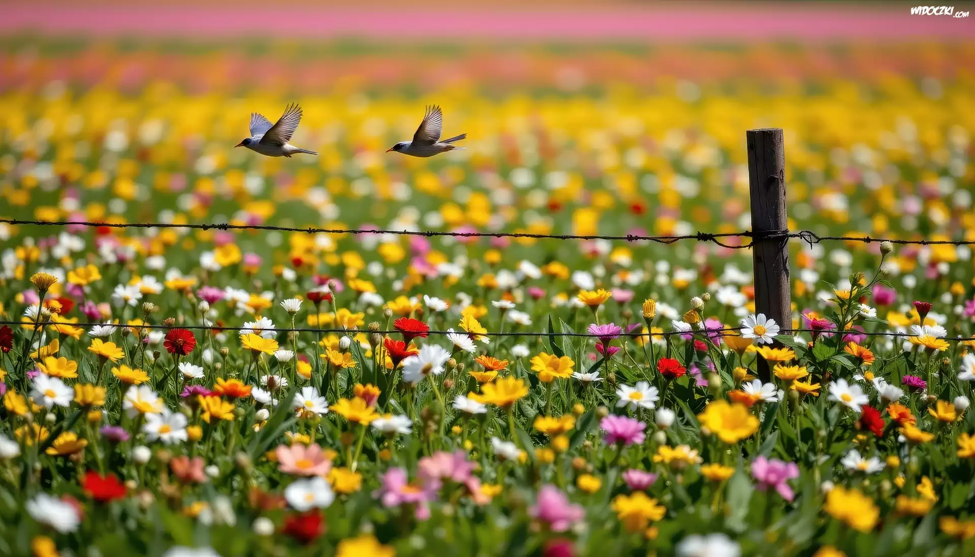 Dwa, Ptaki, Kwiaty, Łąka, Ogrodzenie