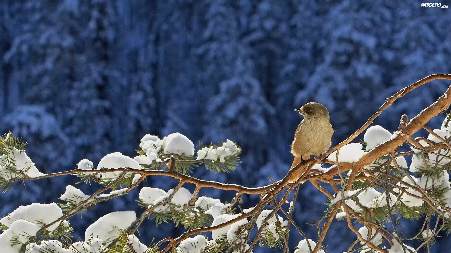Zdjęcia, Ptaszek, Zima, Gałązka, Iglaka, Śnieg