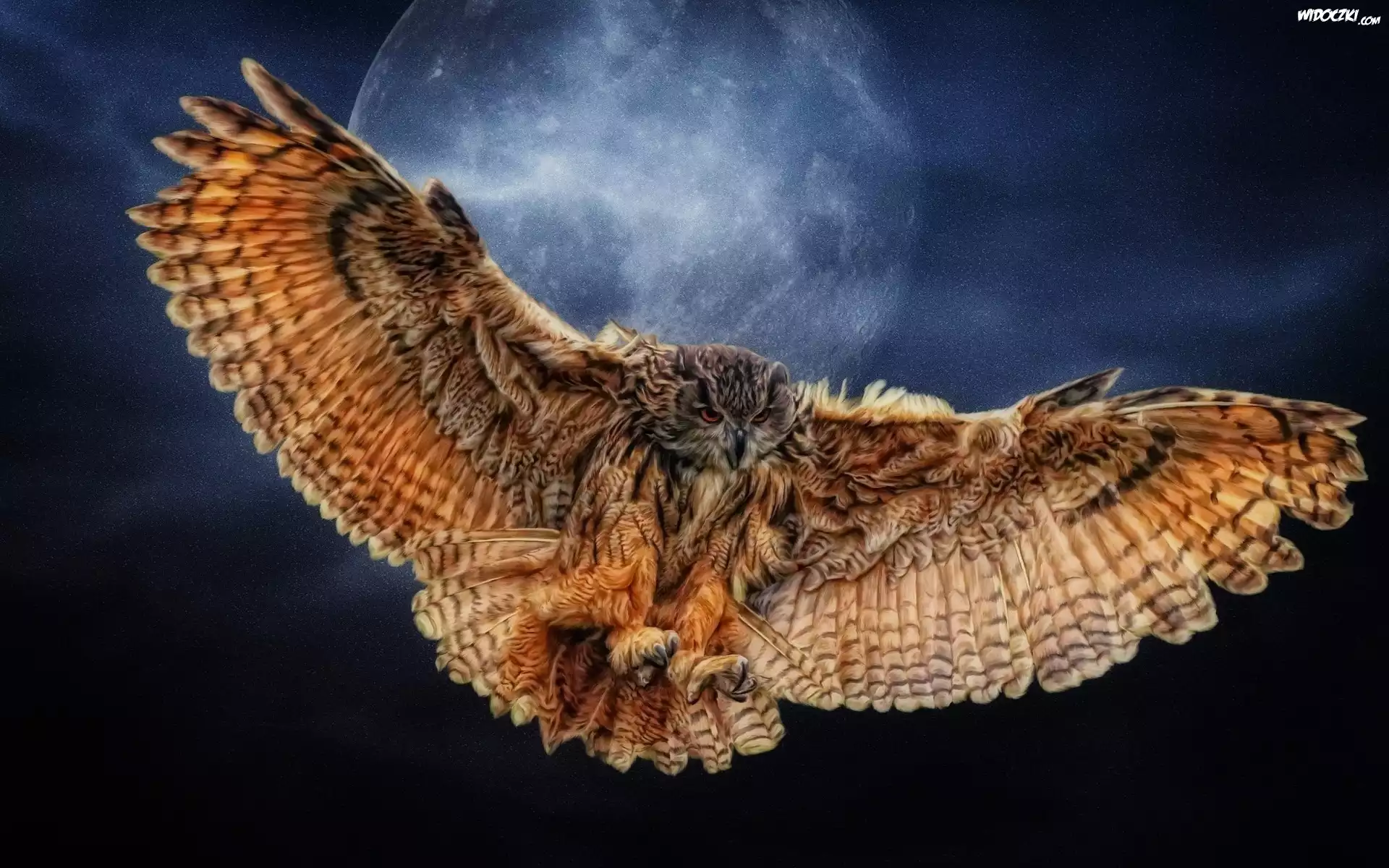 Zdjęcia, Puchacz, W, Locie, Księżyc, Niebo, Grafika