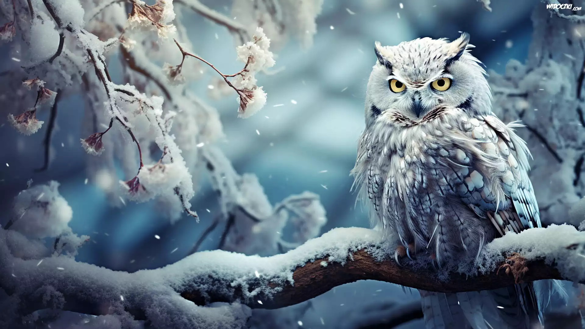 Zima, Ptak, Sowa, Puchacz, Konar, Gałęzie, Śnieg