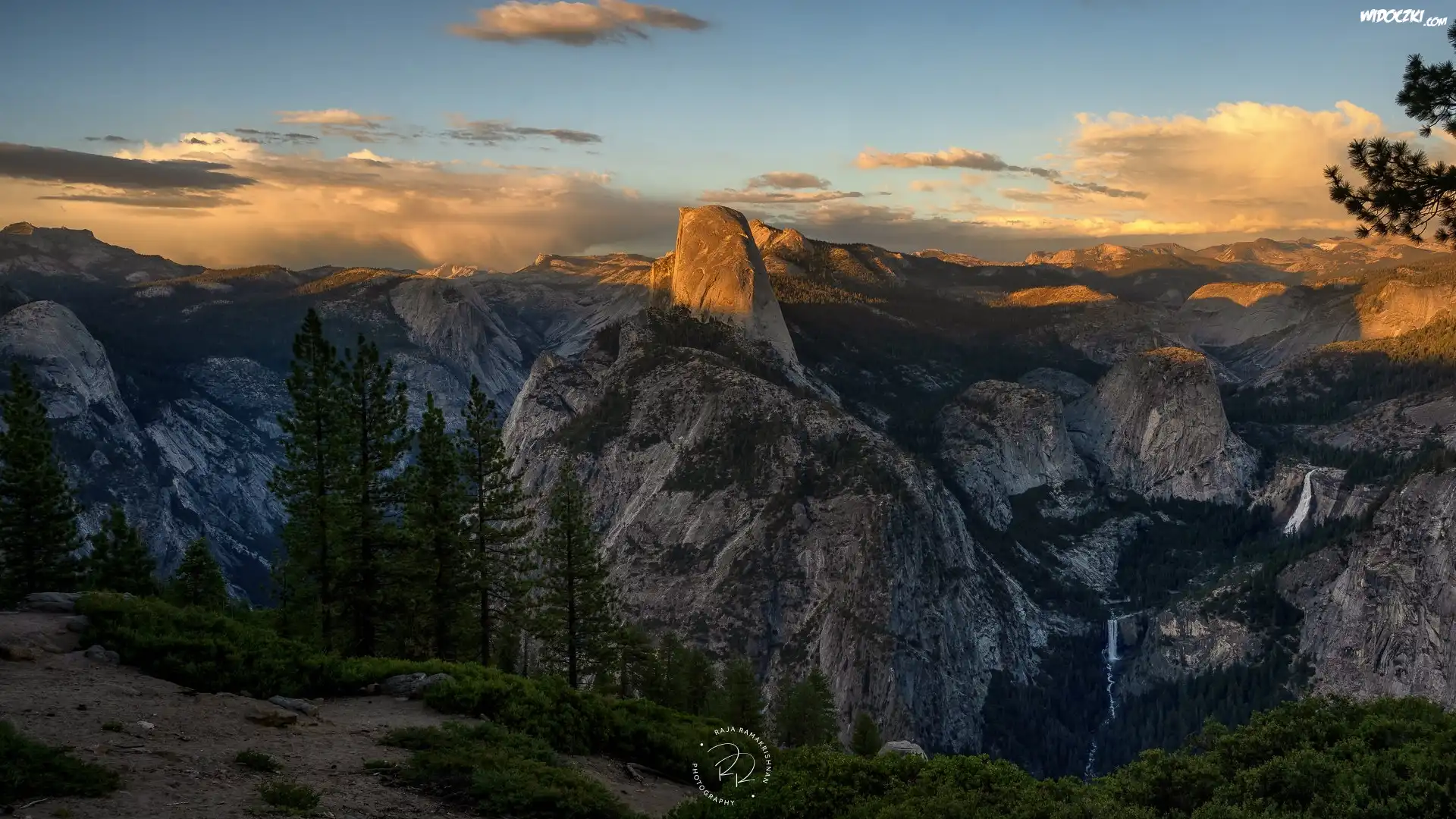 Stany Zjednoczone, Kalifornia, Park Narodowy Yosemite, Punk widokowy, Washburn Point, Góry, Half Dome, Drzewa, Zachód słońca |