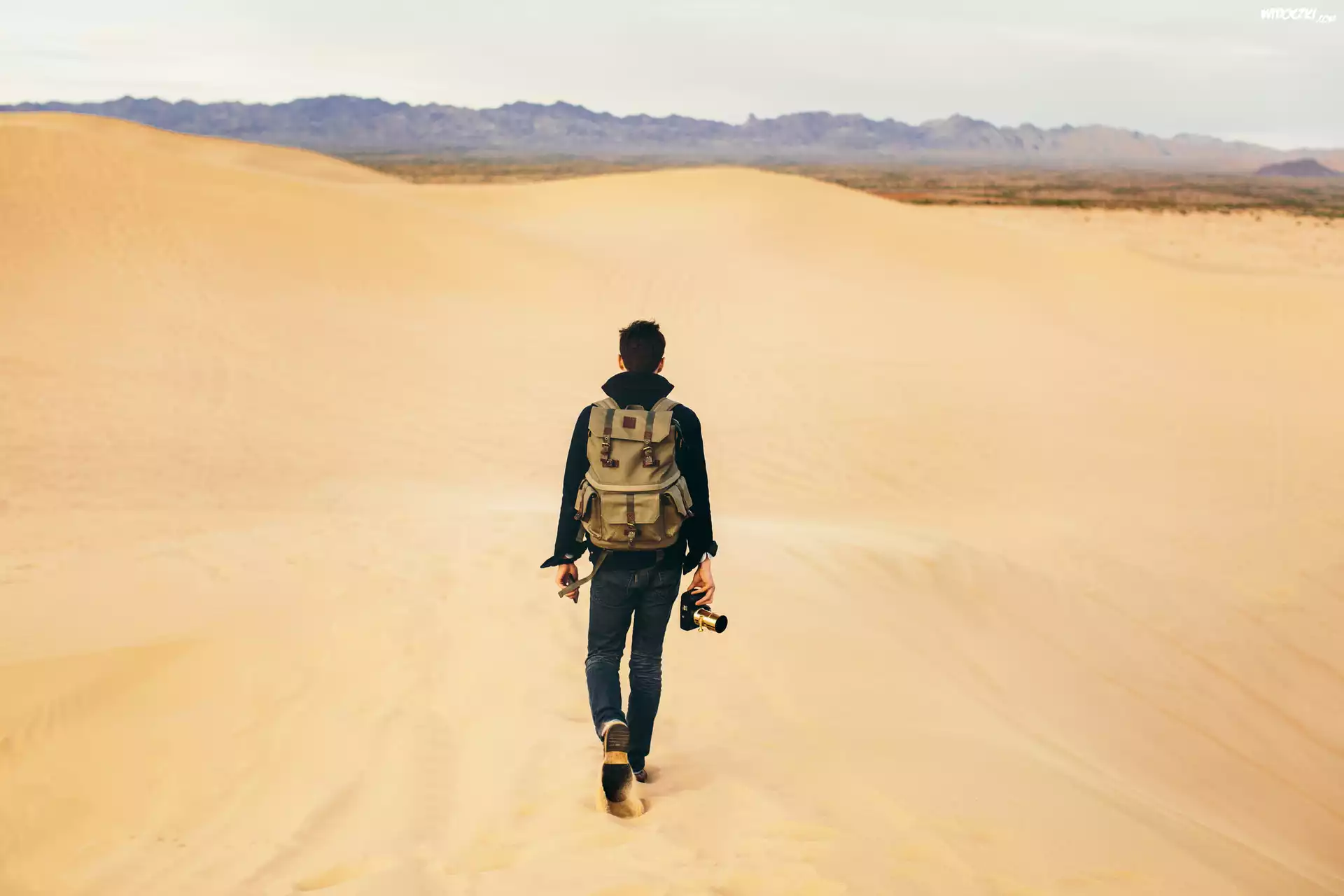 Zdjęcia, Pustynia, Mężczyzna, Plecak, Aparat fotograficzny
