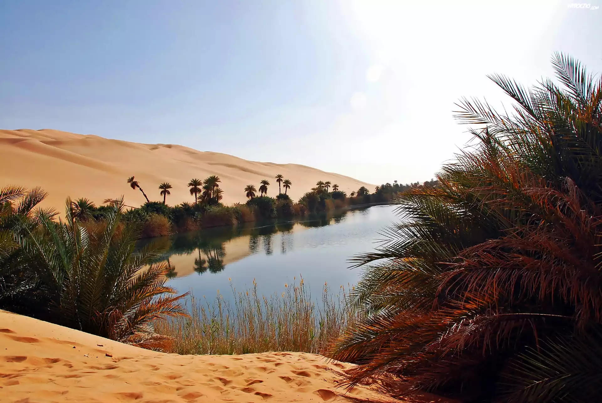 Zdjęcia, Pustynia, Oaza, Jezioro, Palmy