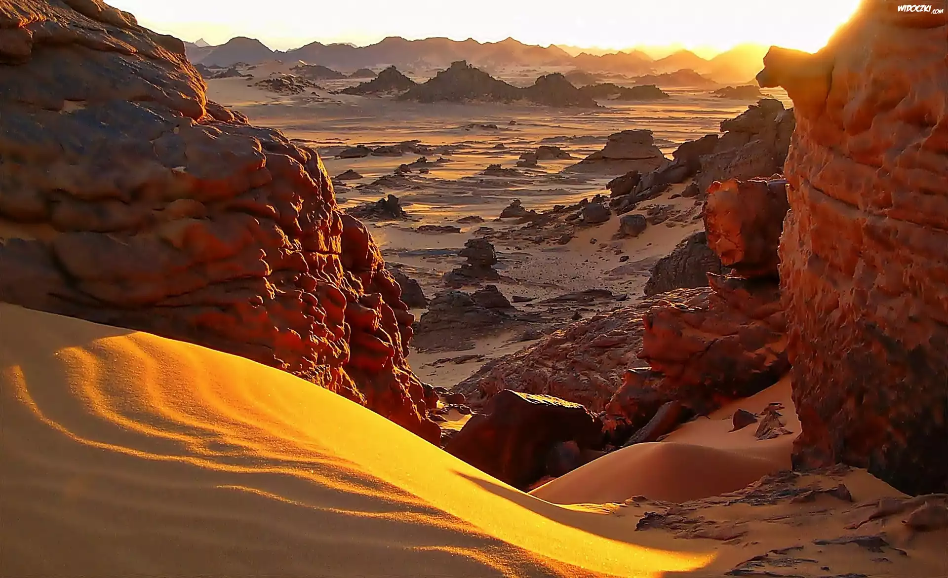Zdjęcia, Pustynia, Skały, Piasek, Niebo,Promienie Słońca