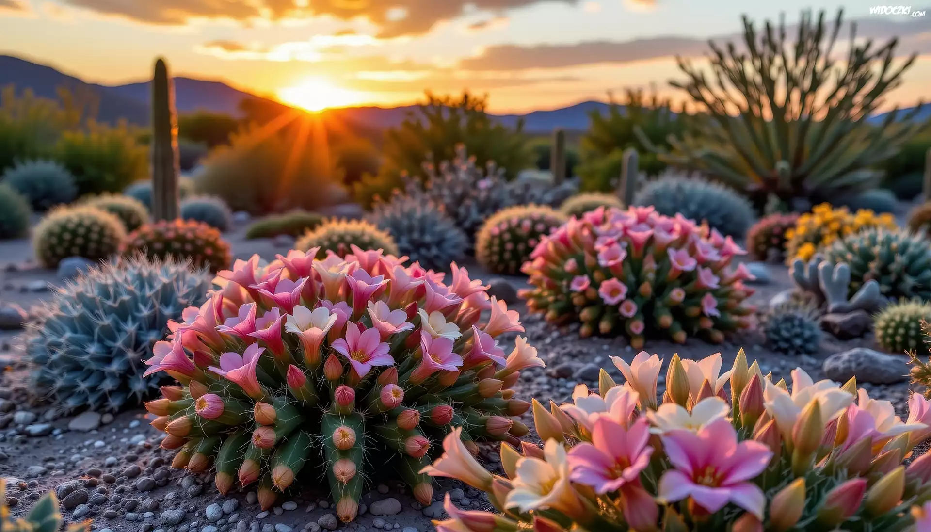 Zdjęcia, Pustynia, Kwitnące, Kaktusy, Zachód słońca, Grafika, USA, Tucson, Sonora
