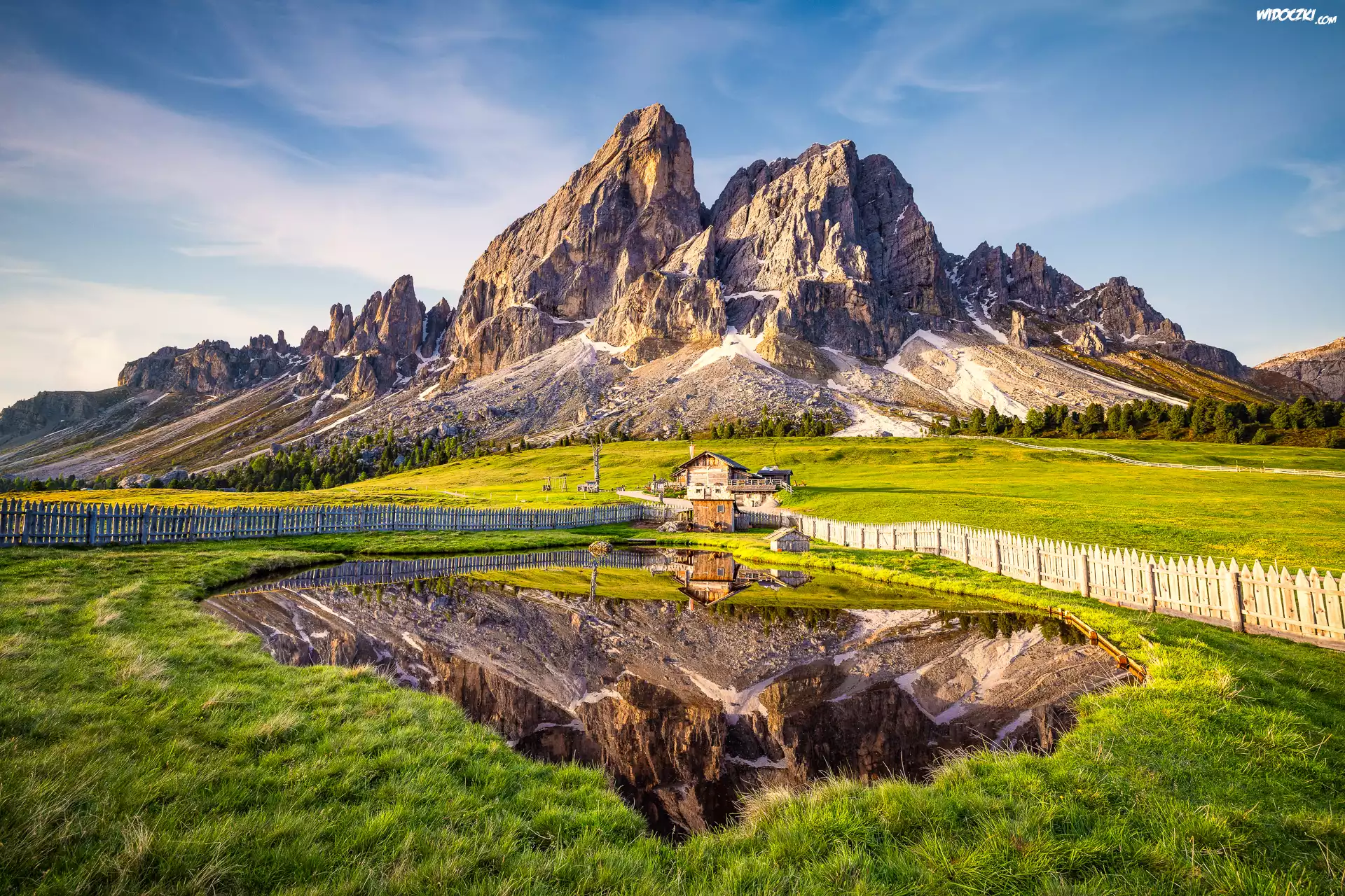 Zdjęcia, Włochy, Góry, Dolomity, Szczyt, Sass de Putia, Staw, Dom, Ogrodzenie, Łąki