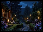 Dom, Latarnie, Żywopłot, Rabatki, Kwiaty, Ogród