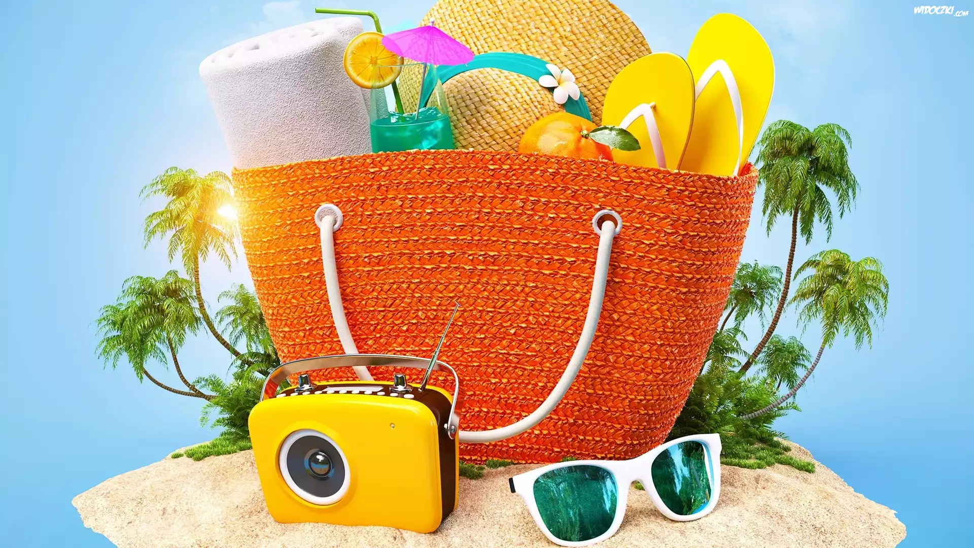 Zdjęcia, Lato, Wakacje, Plaża, Palmy, Torba, Radio, Okulary, Klapki, Kapelusz, Drink, Grafika 2D