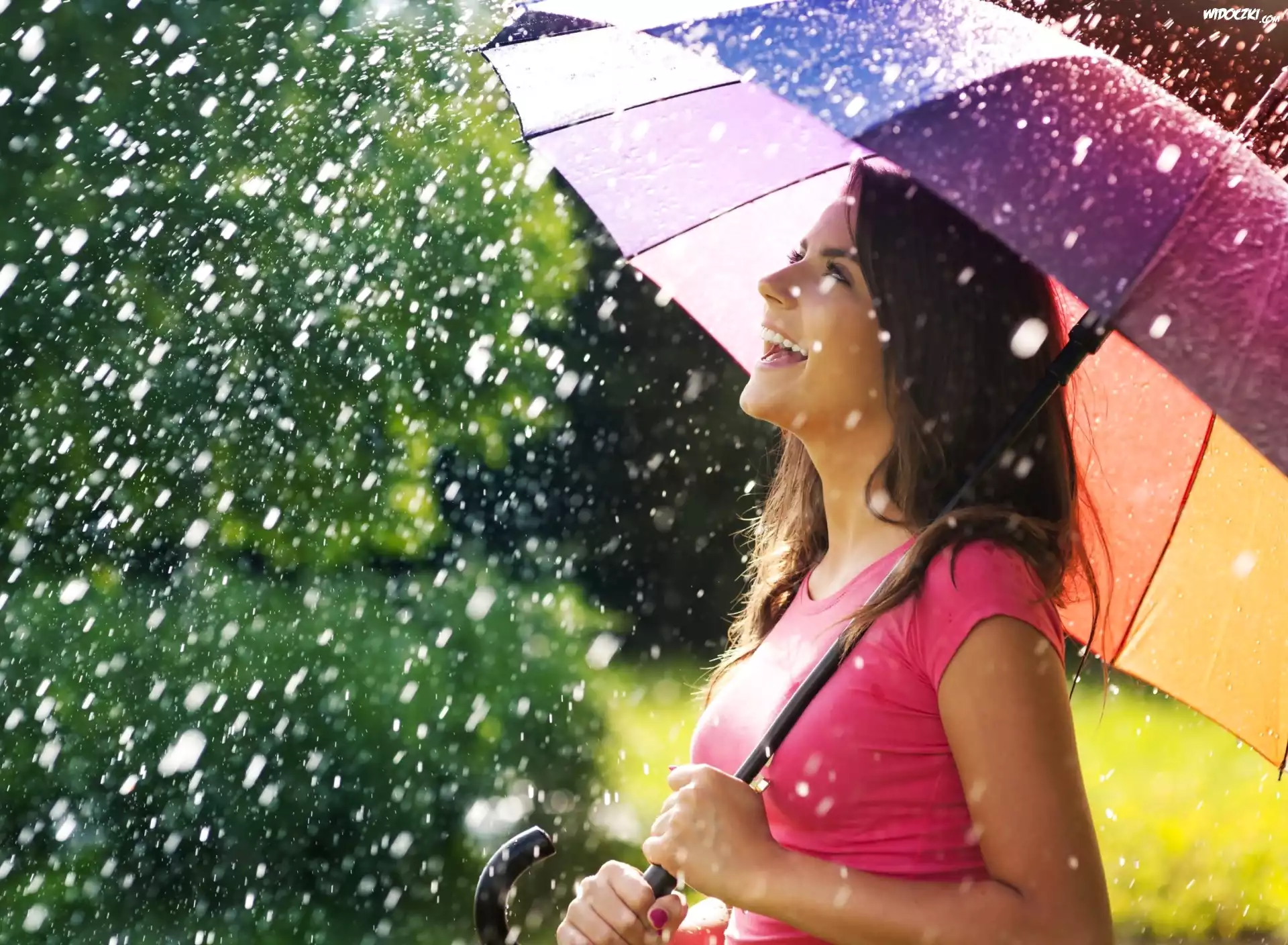 Radosna, Kobieta, Deszcz, Kolorowa, Parasolka