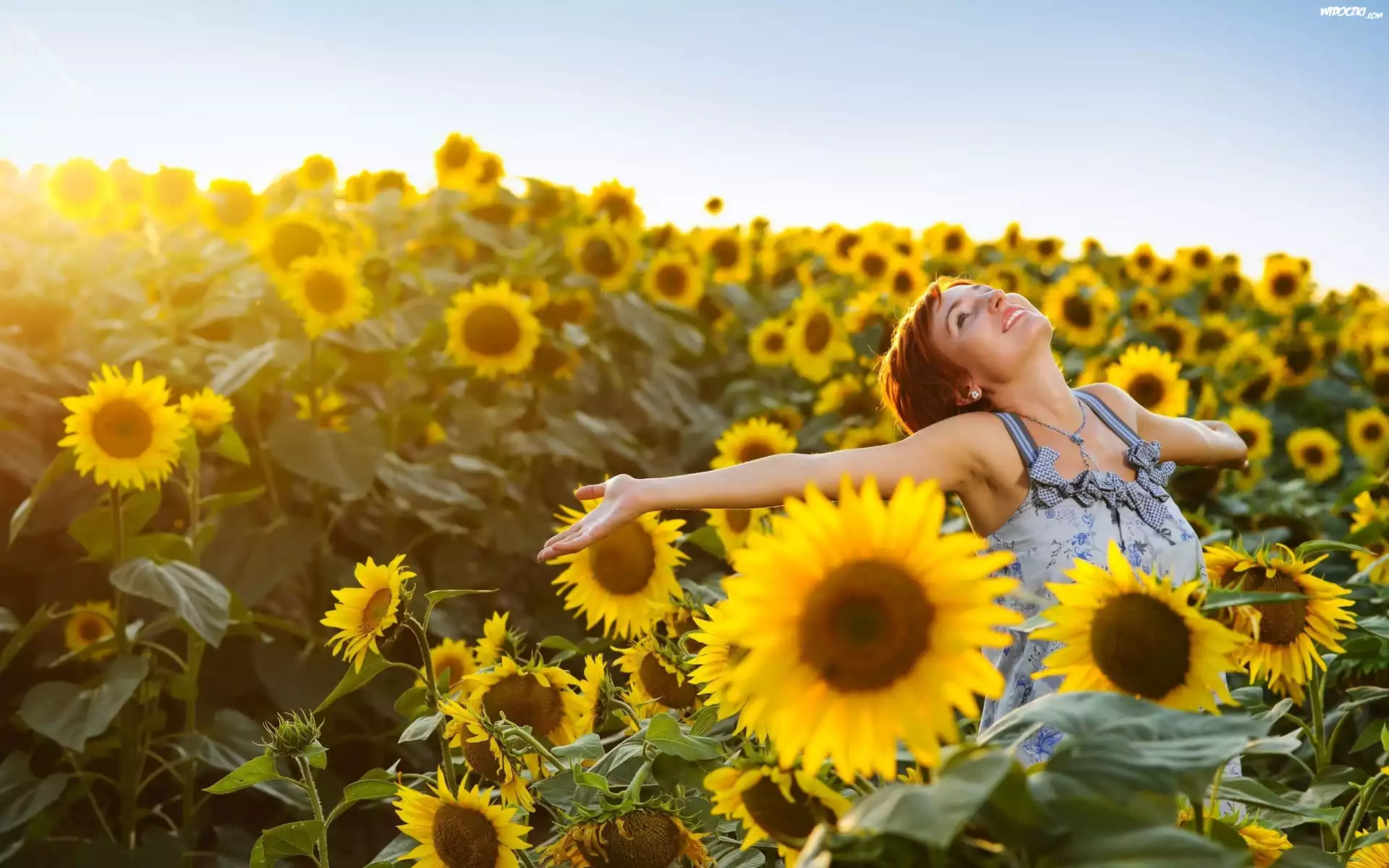 Zdjęcia, Radosna, Dziewczyna, Pole, Słoneczników