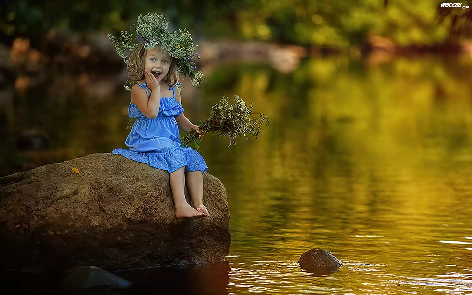 Radosna, Dziewczynka, Niebieska, Sukienka, Wianek