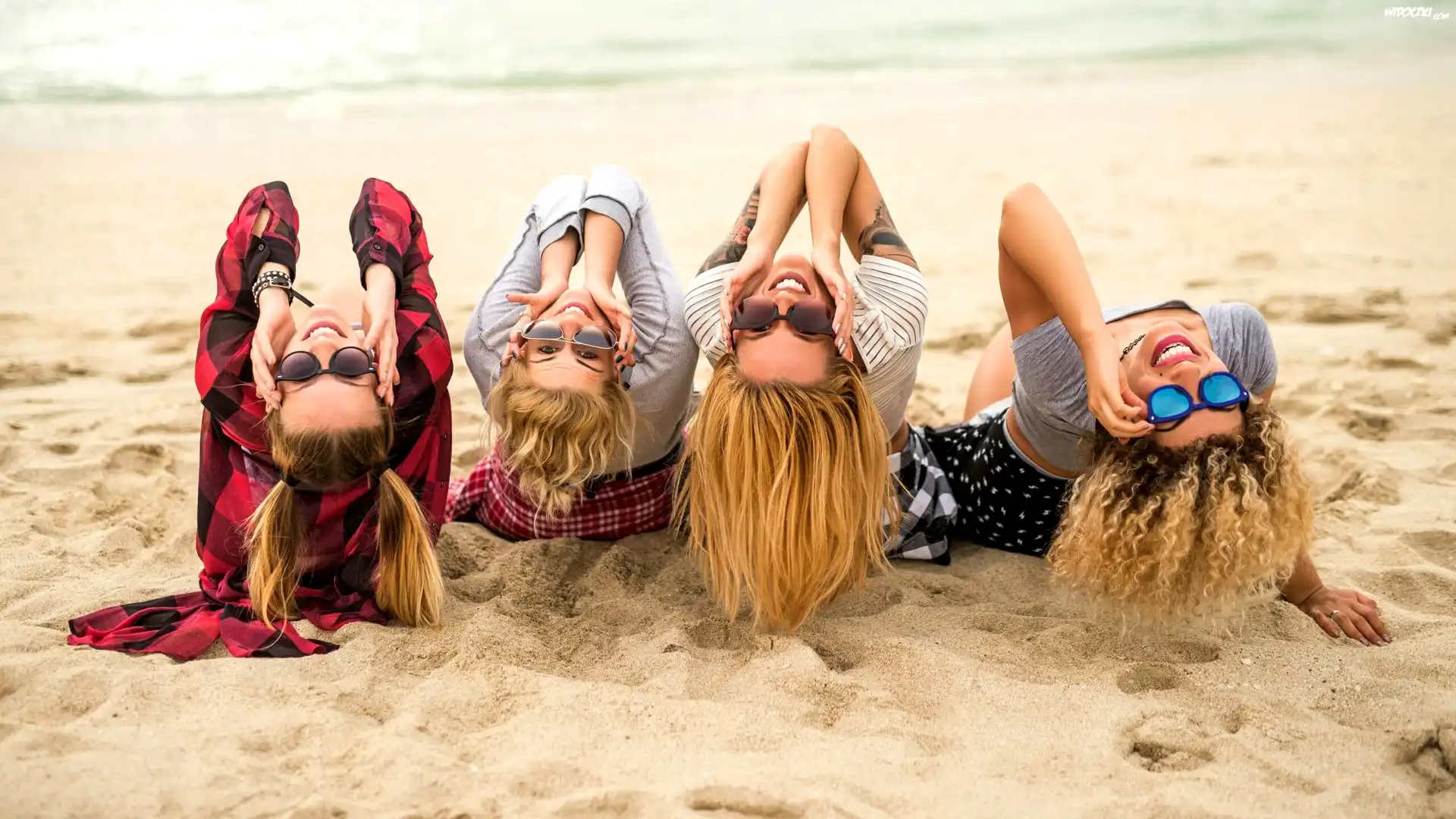 Zdjęcia, Radosne, Uśmiechnięte, Dziewczyny, Okulary, Plaża, Wakacje