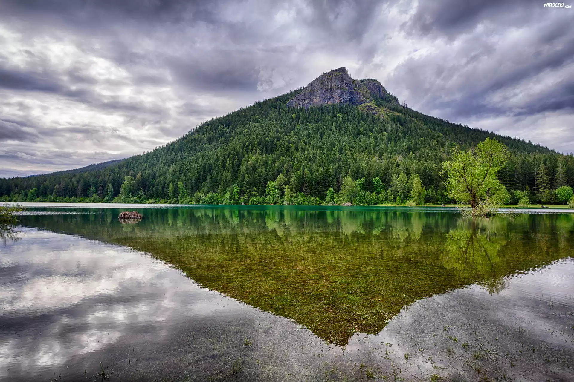 Góra Rattlesnake Ridge, Jezioro Rattlesnake Lake, Drzewa, Las, Chmury, Odbicie, Stan Waszyngton, Stany Zjednoczone |