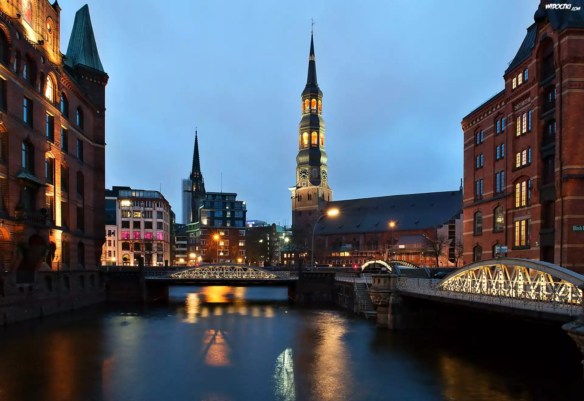 Zdjęcia, Domy, Ratusz, Rzeka, Alster, Most, Nocna Panorama, Hamburga