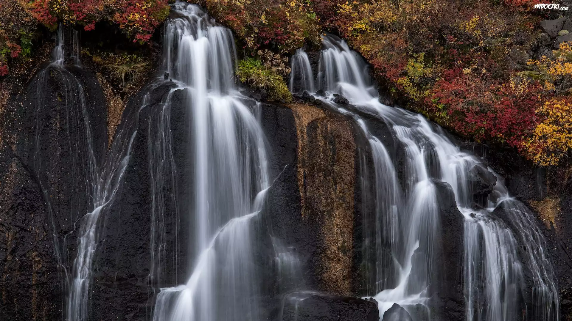 Zdjęcia, Islandia, Region Vesturland, Wodospad Hraunfossar, Skały, Jesienna, Roślinność