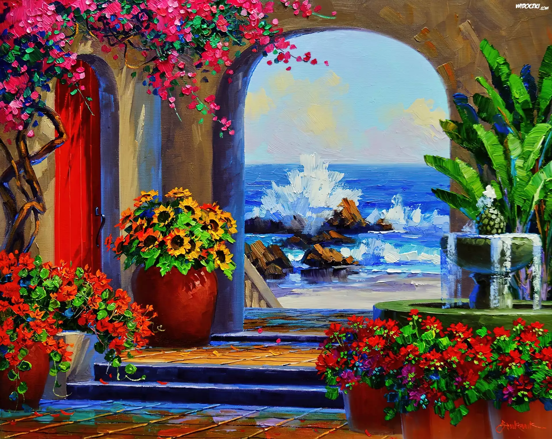 Zdjęcia, Reprodukcje Obrazów, Kwiaty, Morze, Weranda