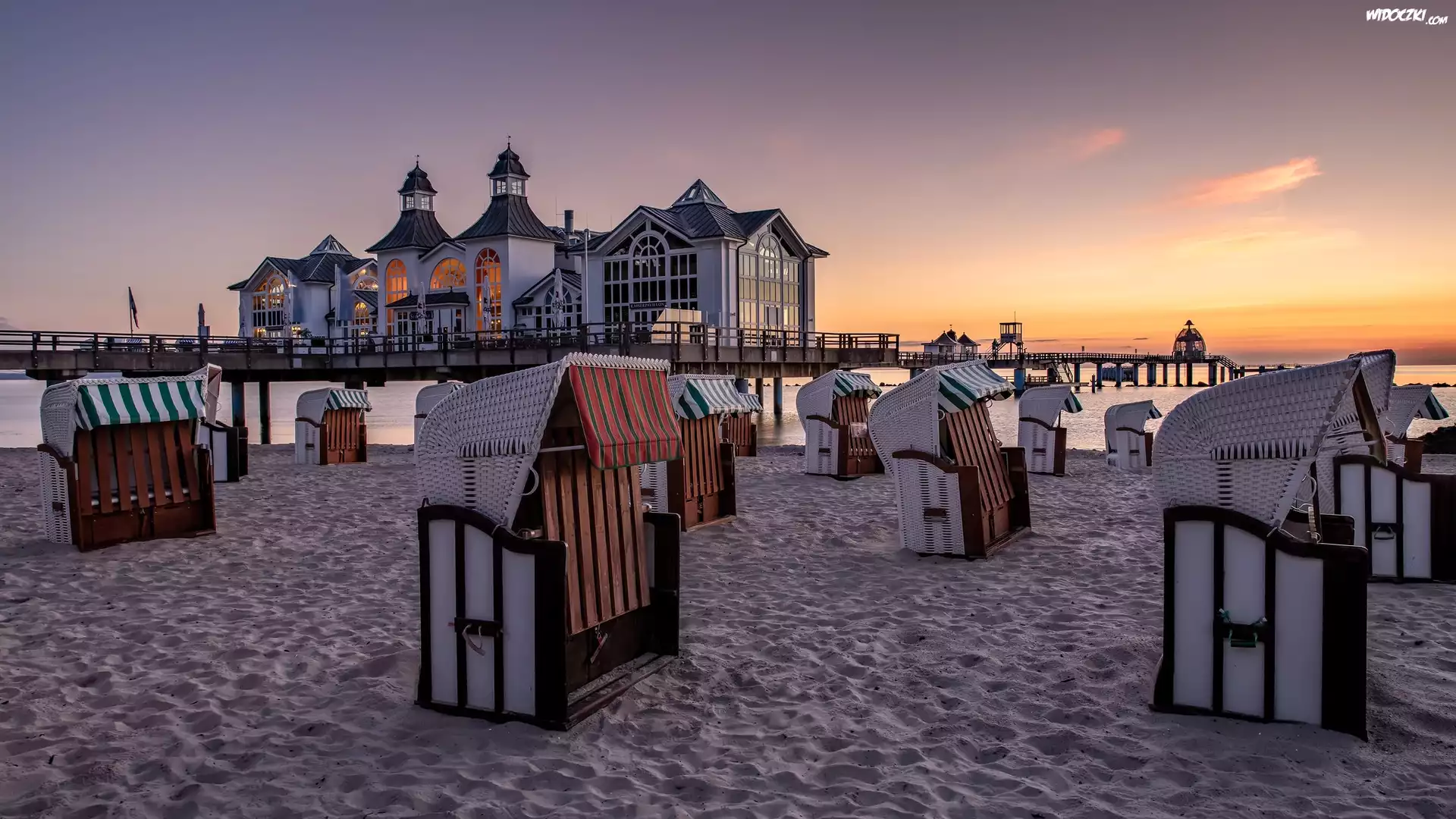 Morze Bałtyckie, Zachód słońca, Restauracja, Kawiarnia, Plaża, Kosze plażowe, Molo, Sellin, Wyspa Rugia, Niemcy |
