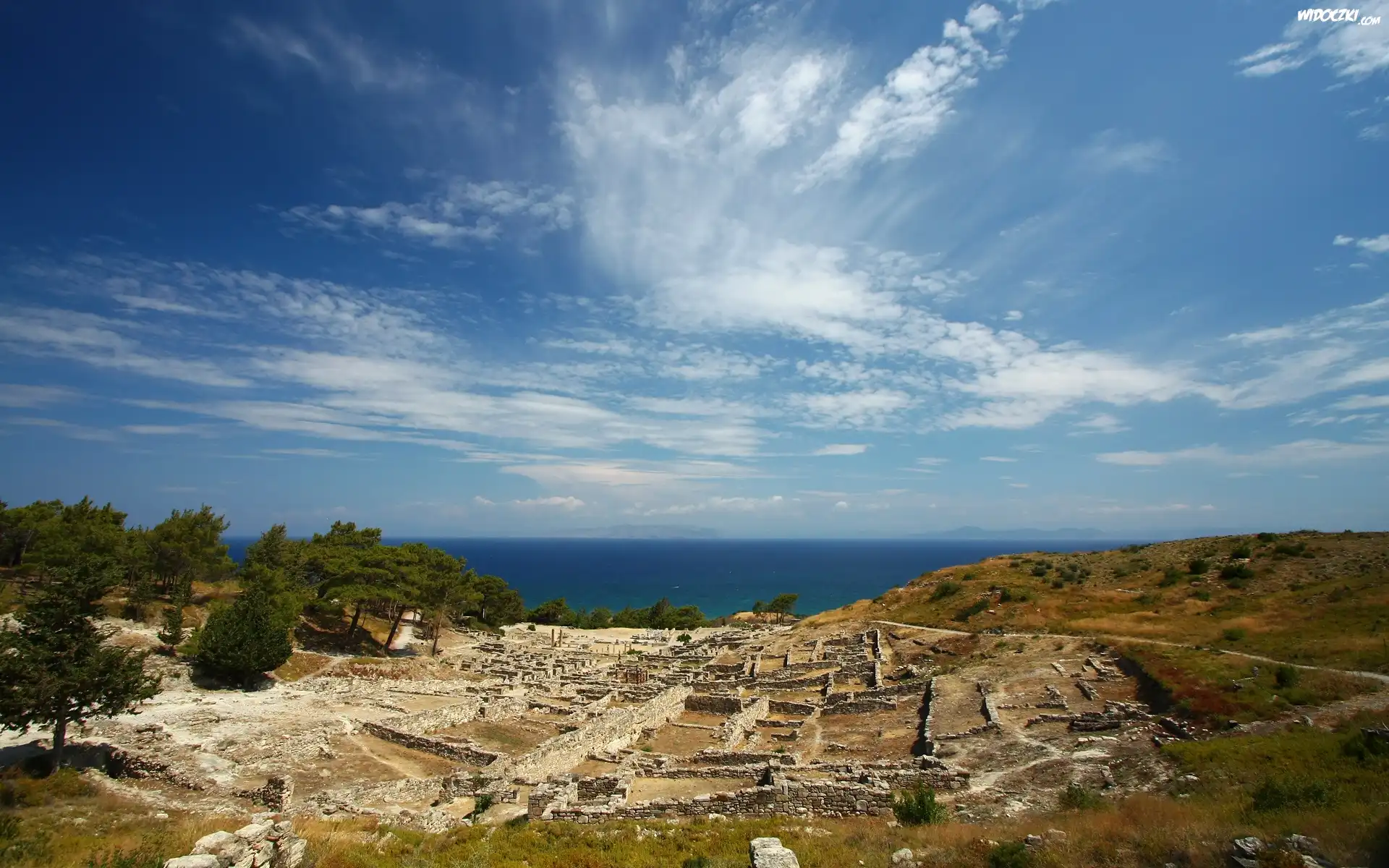 Resztki, Ruin, Drzewa, Morze, Niebo