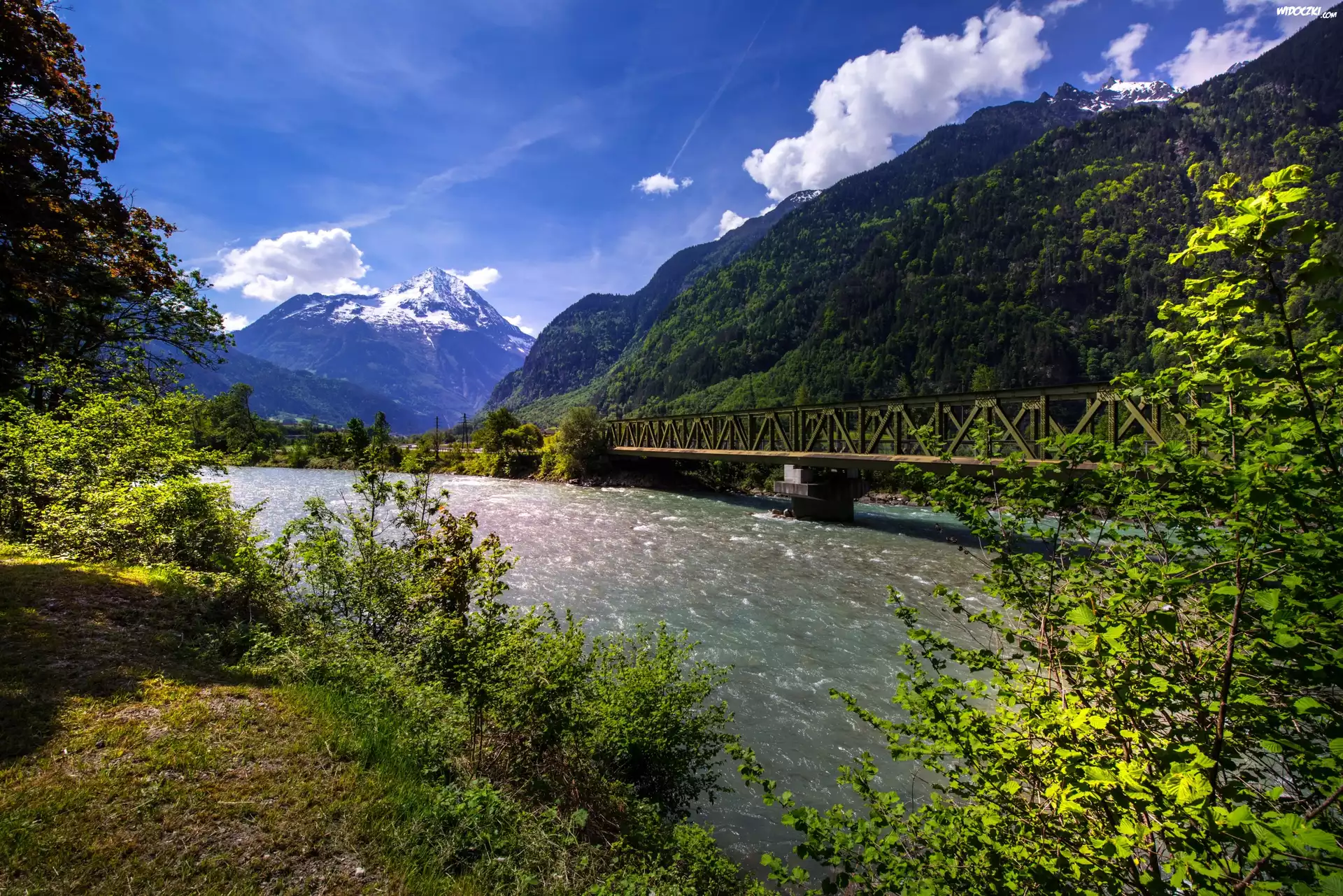 Zdjęcia, Rzeka Reuss, Szwajcaria, Most, Góry, Drzewa, Chmury