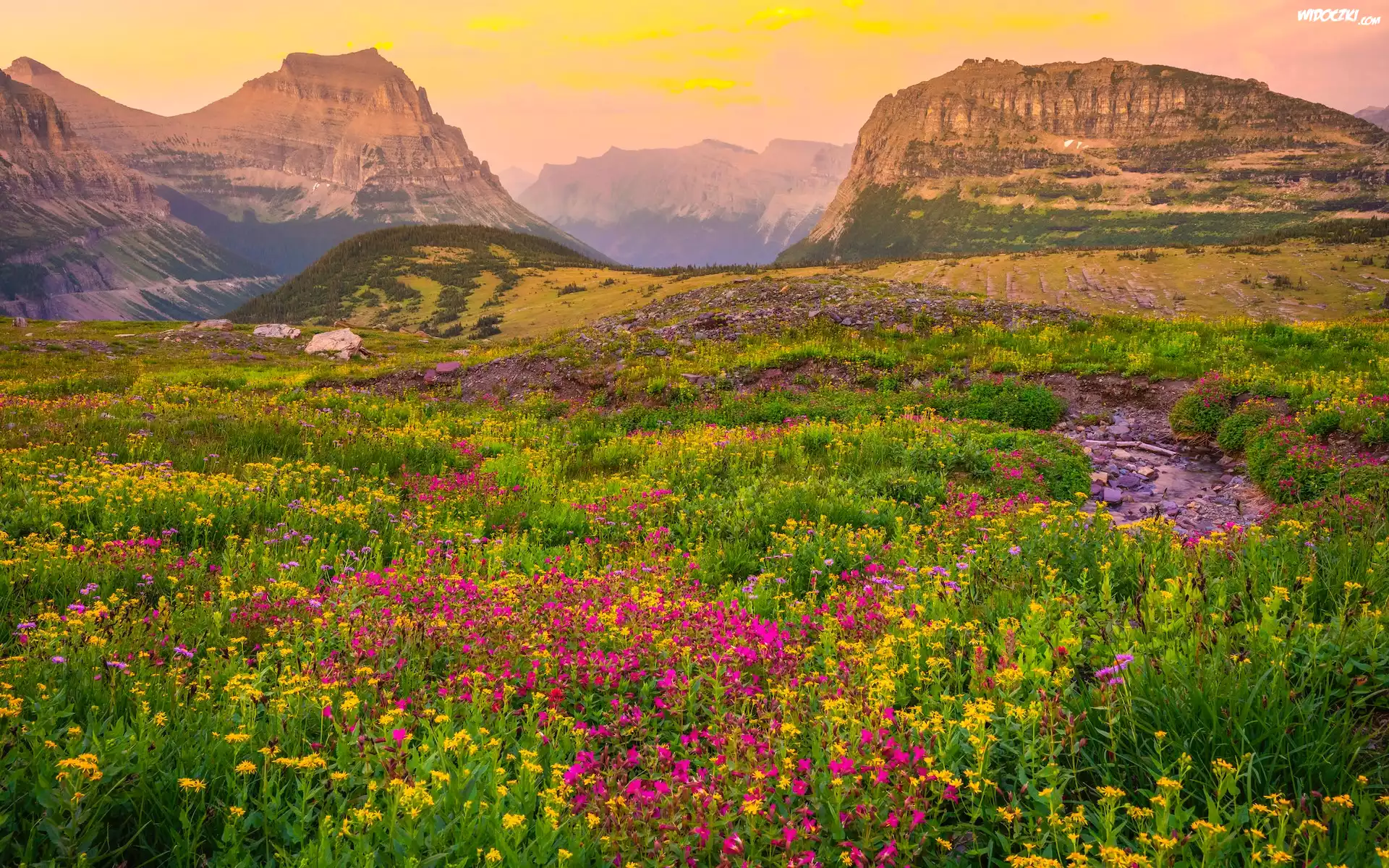Zdjęcia, Stany Zjednoczone, Montana, Park Narodowy Glacier, Góry Skaliste, Mount Reynolds, Łąka, Kwiaty