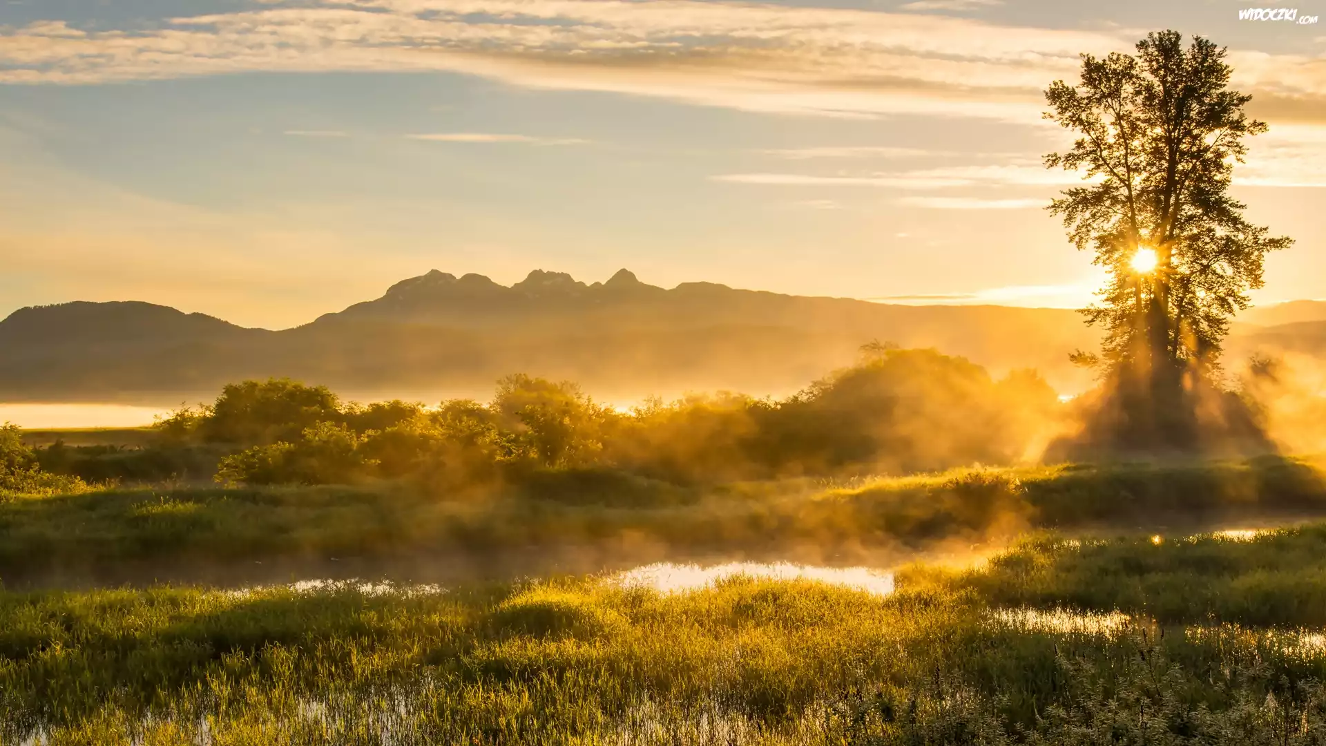 Kanada, Kolumbia Brytyjska, Maple Ridge, Jerry Sulina Park, Drzewa, Mgła, Wschód słońca, Wzgórza, Drzewo |