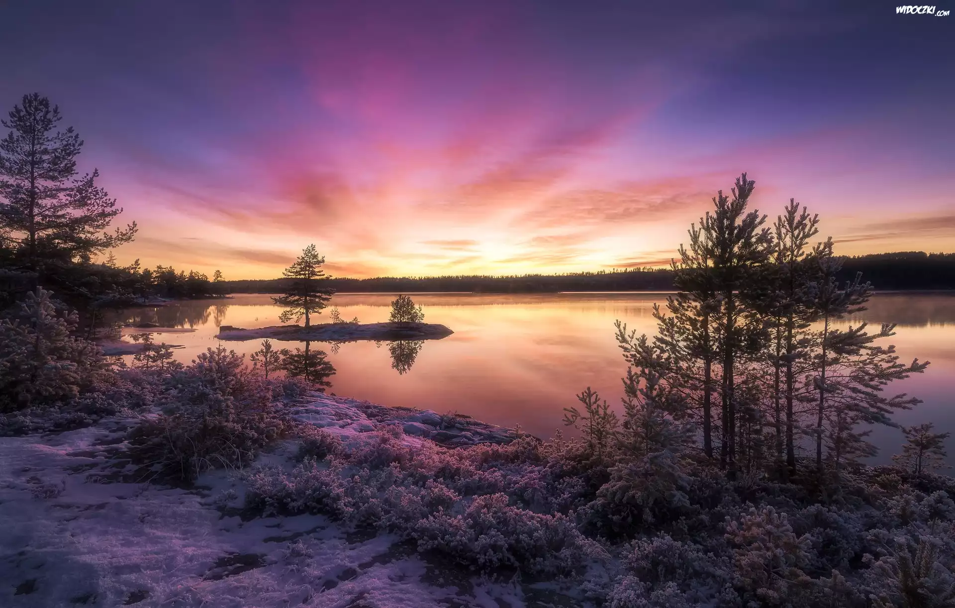Norwegia, Ringerike, Zima, Zachód słońca, Jezioro, Drzewa