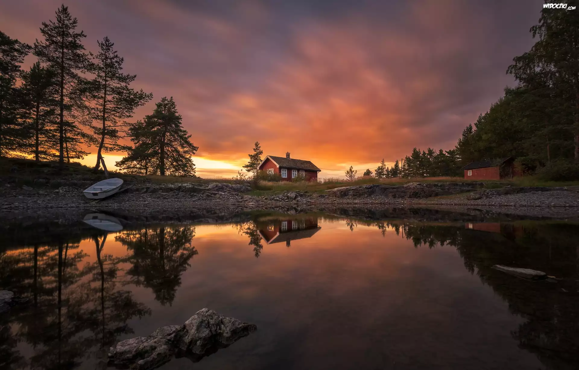 Norwegia, Ringerike, Jezioro, Zachód słońca, Drzewa, Dom, Łódka
