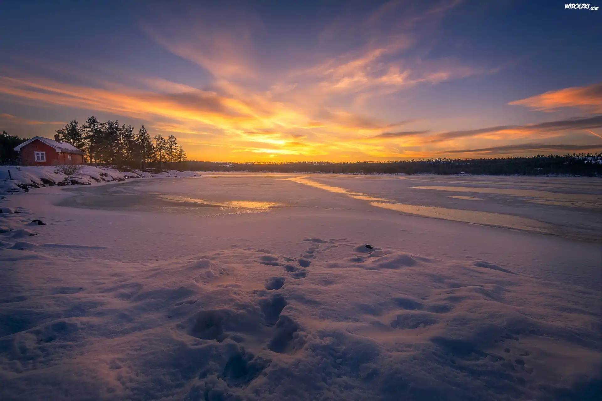Zdjęcia, Norwegia, Ringerike, Zima, Drzewa, Dom, Jezioro, Zachód słońca