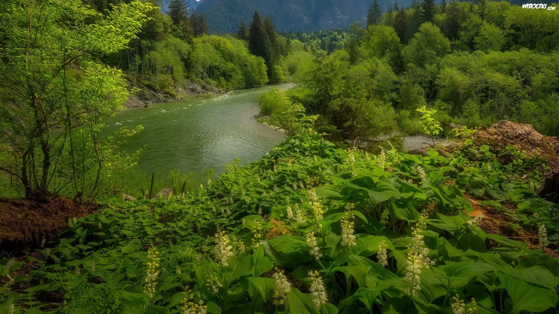 Zdjęcia, Rzeka, Snoqualmie River, Roślinność, Drzewa, Krzewy, Kwiaty, Stan Waszyngton, Stany Zjednoczone