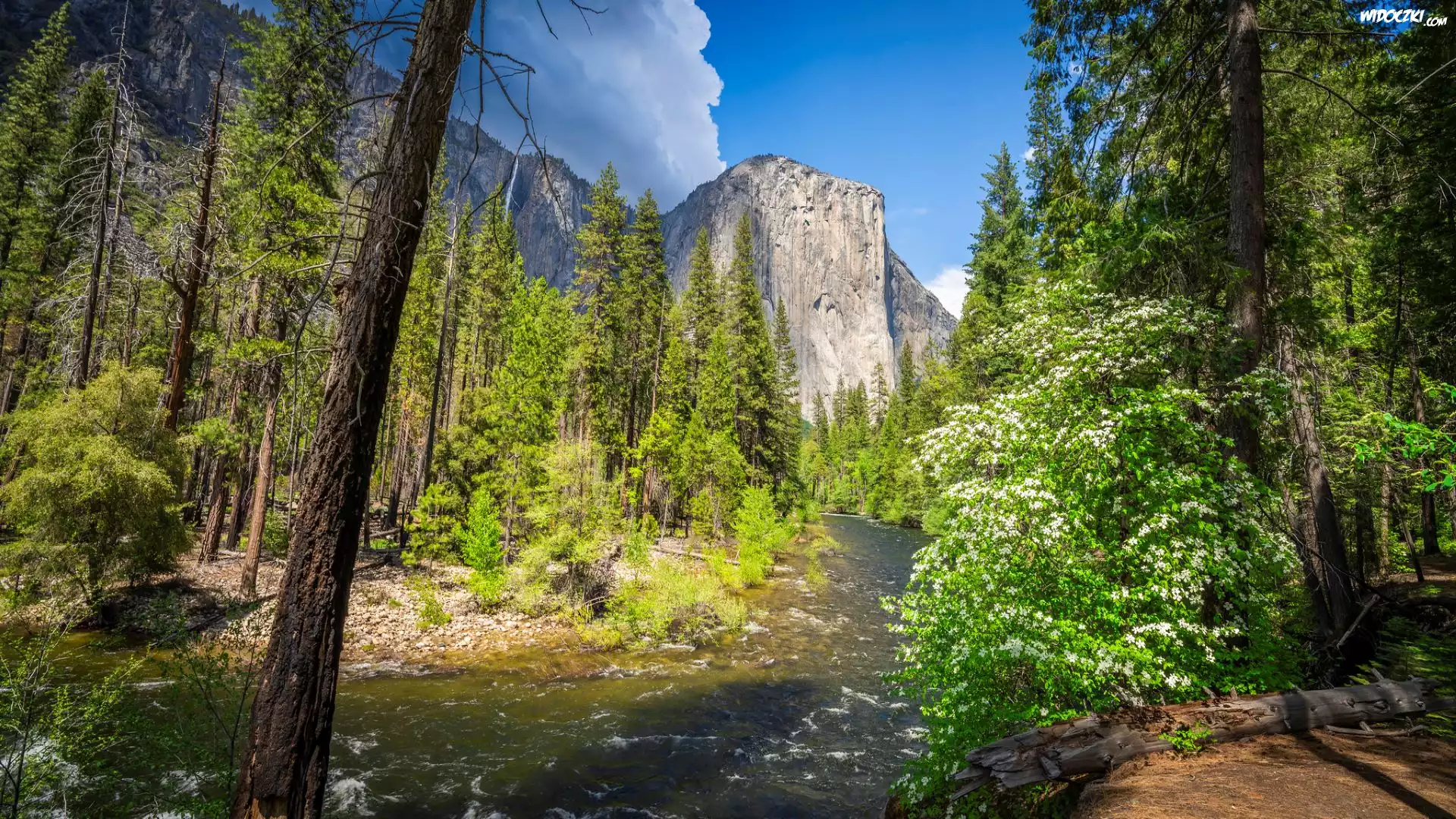 Park Narodowy Yosemite, Góra, El Capitan, Rzeka, Merced River, Drzewa, Krzewy, Stany Zjednoczone, Kalifornia |