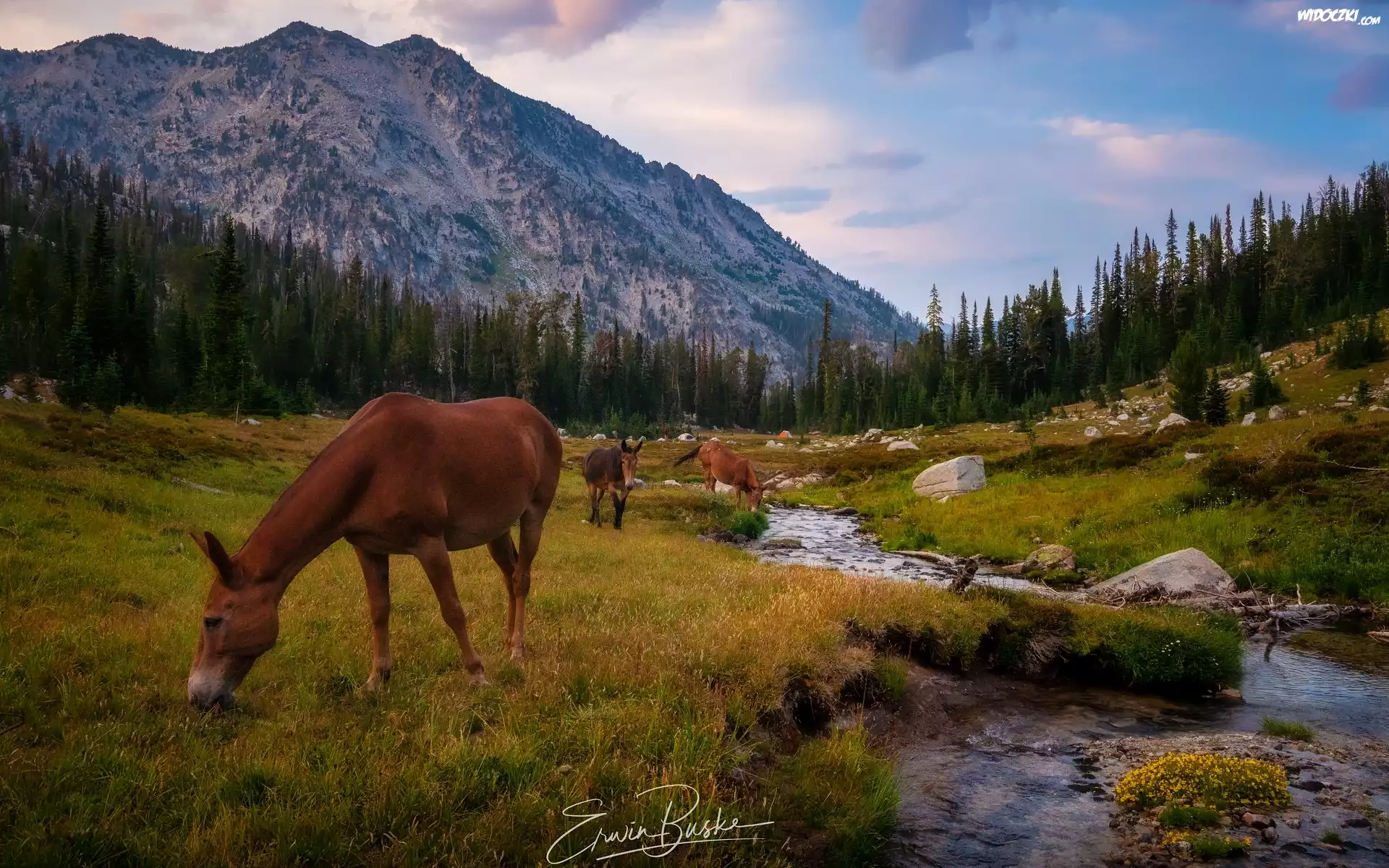 Zdjęcia, Góry, Wallowa Mountains, Rzeka, Lostine River, Konie, Drzewa, Stan Oregon, Stany Zjednoczone