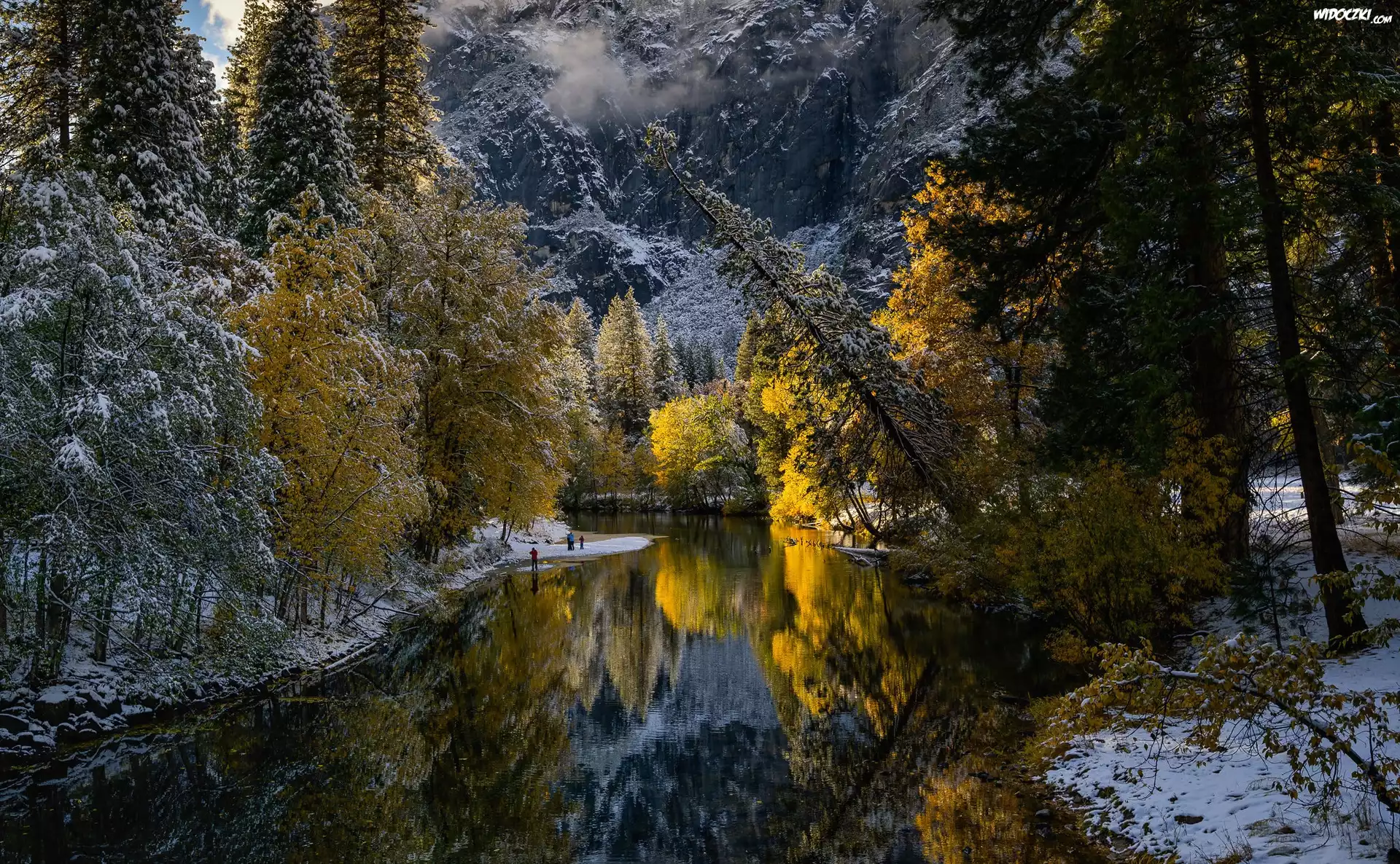 Jesień, Drzewa, Rzeka, Merced River, Park Narodowy Yosemite, Śnieg, Góry, Stan Kalifornia, Stany Zjednoczone |