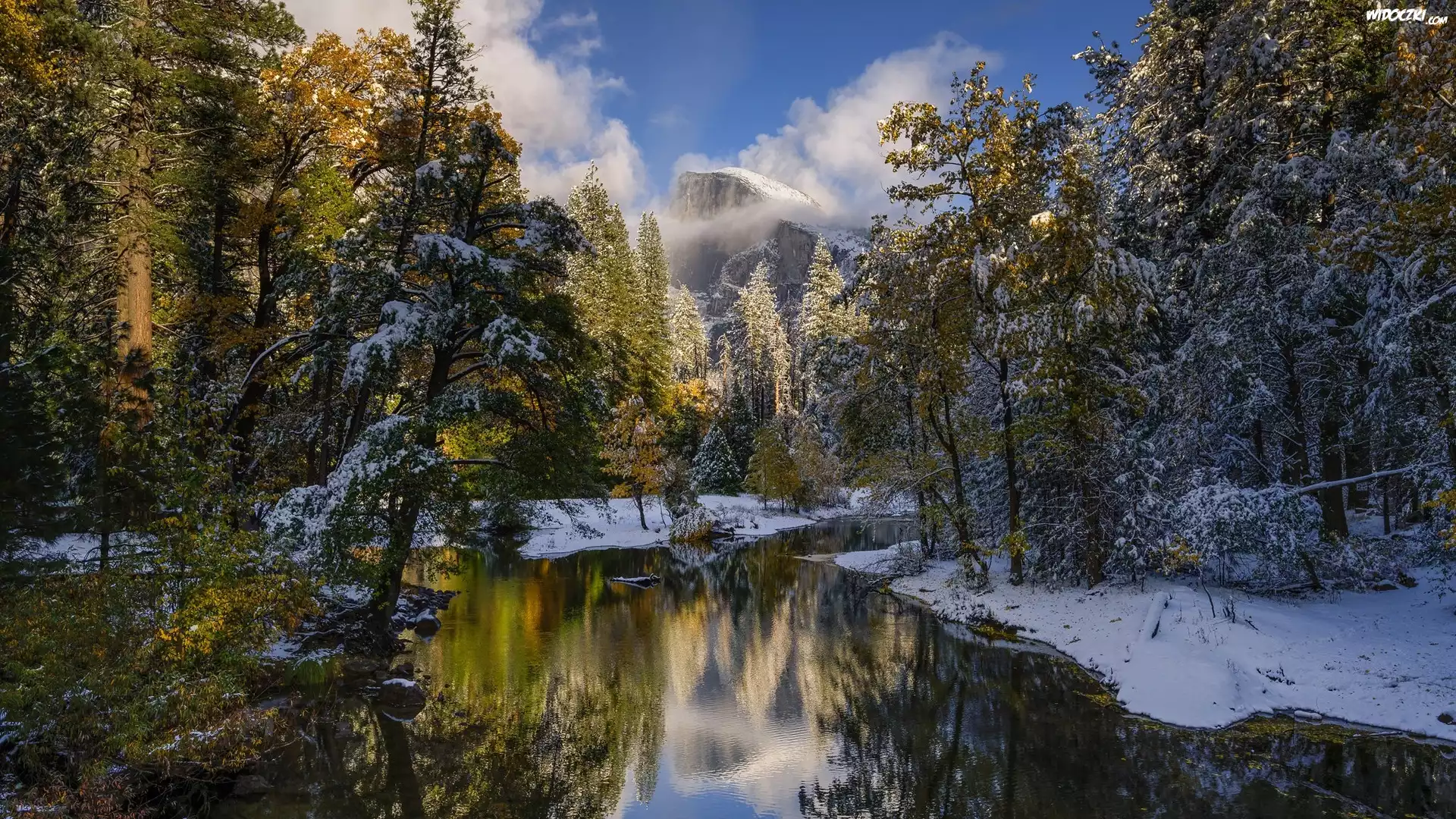 Zdjęcia, Park Narodowy Yosemite, Rzeka, Merced River, Góry, Drzewa, Śnieg, Kalifornia, Stany Zjednoczone