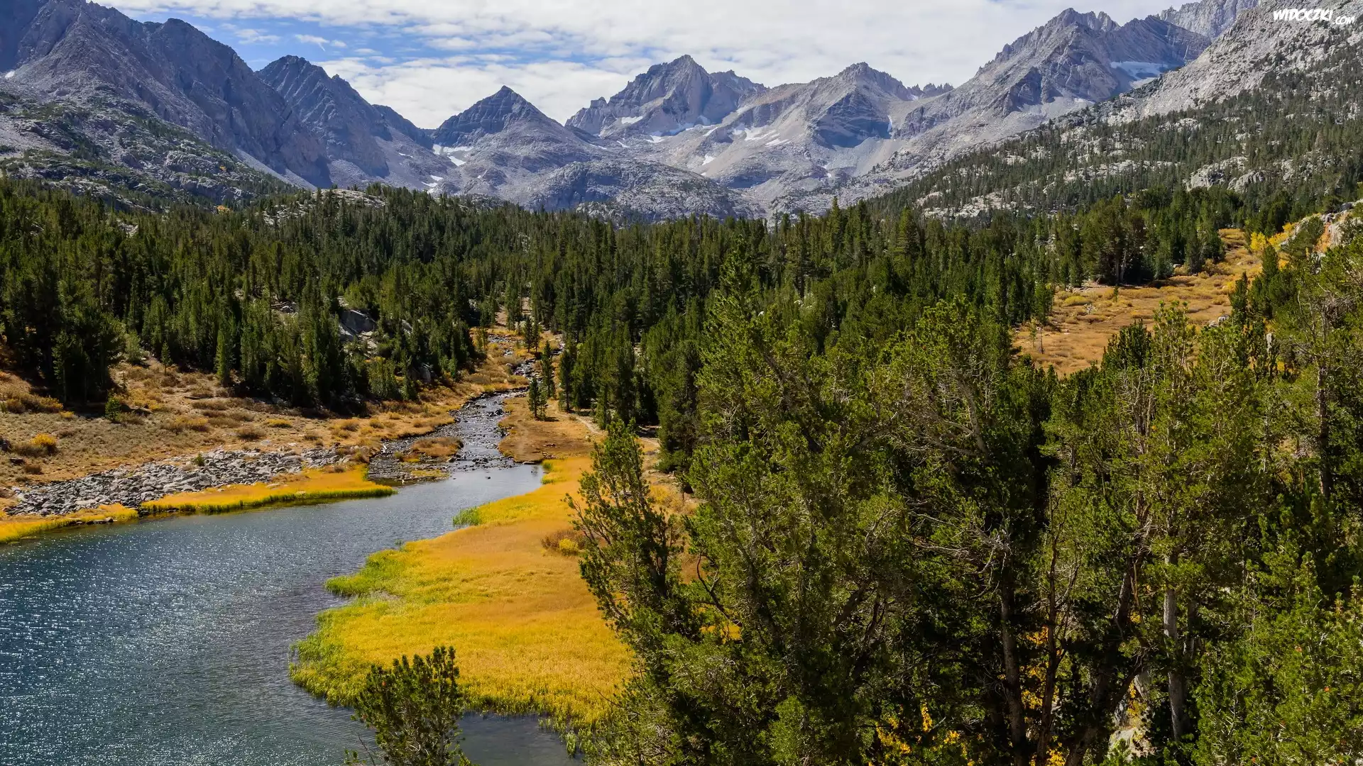Góry, Sierra Nevada, Rzeka, Rock Creek, Drzewa, Lasy, Eastern Sierra, Stan Kalifornia, Stany Zjednoczone |
