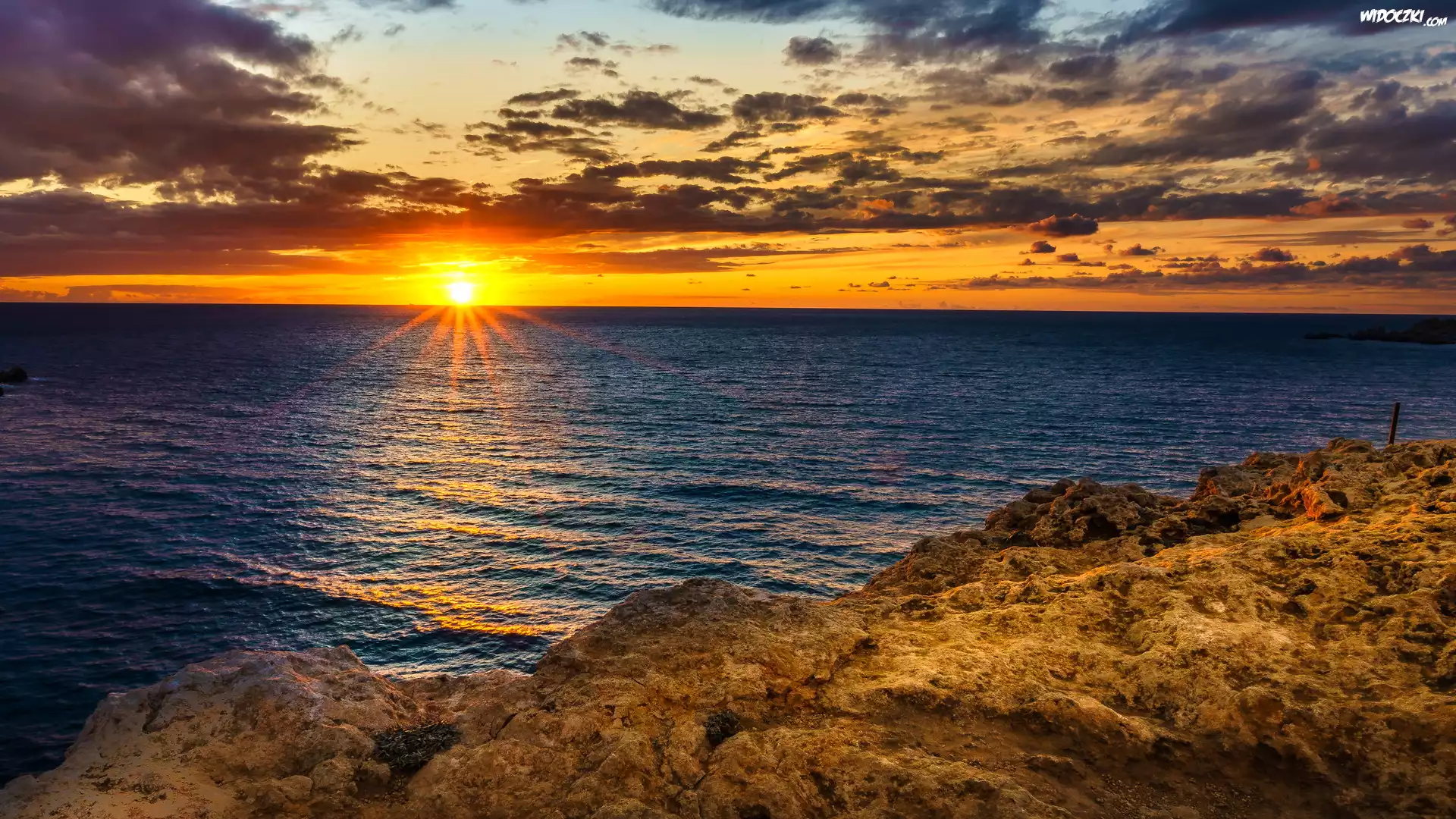 Morze Śródziemne, Zachód słońca, Chmury, Skały, Mgarr, Malta
