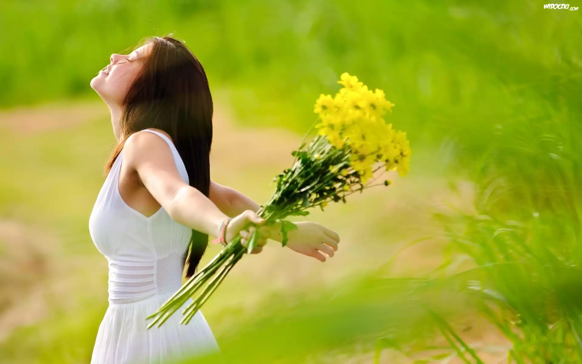 Zdjęcia, Romantyczna, Dziewczyna, Łąka, Bukiet, Kwiatów