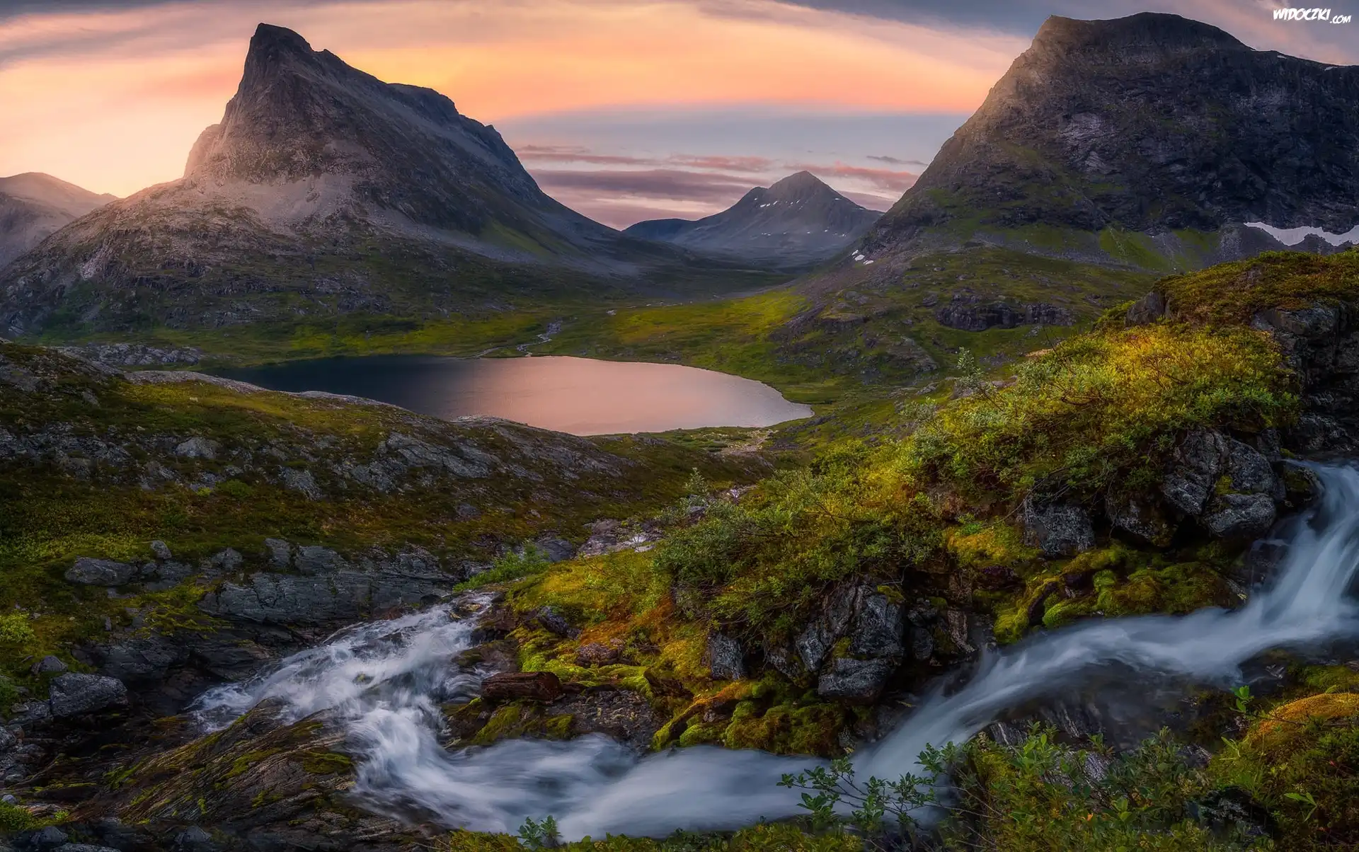Dolina Romsdalen, Norwegia, Góry, Jezioro, Wodospad, Roślinność
