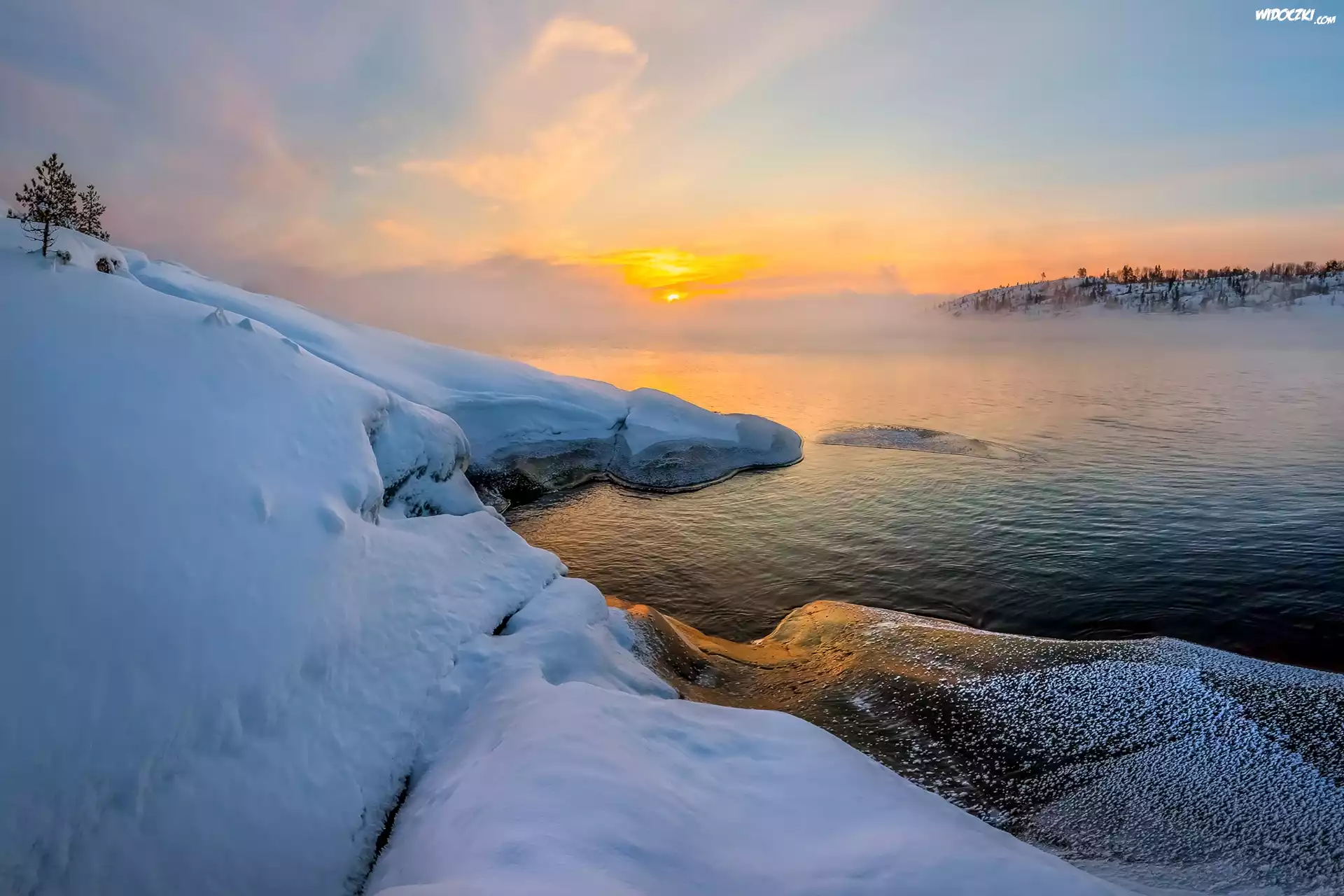 Zdjęcia, Zima, Jezioro Ładoga, Mgła, Wschód słońca, Drzewa, Karelia, Rosja