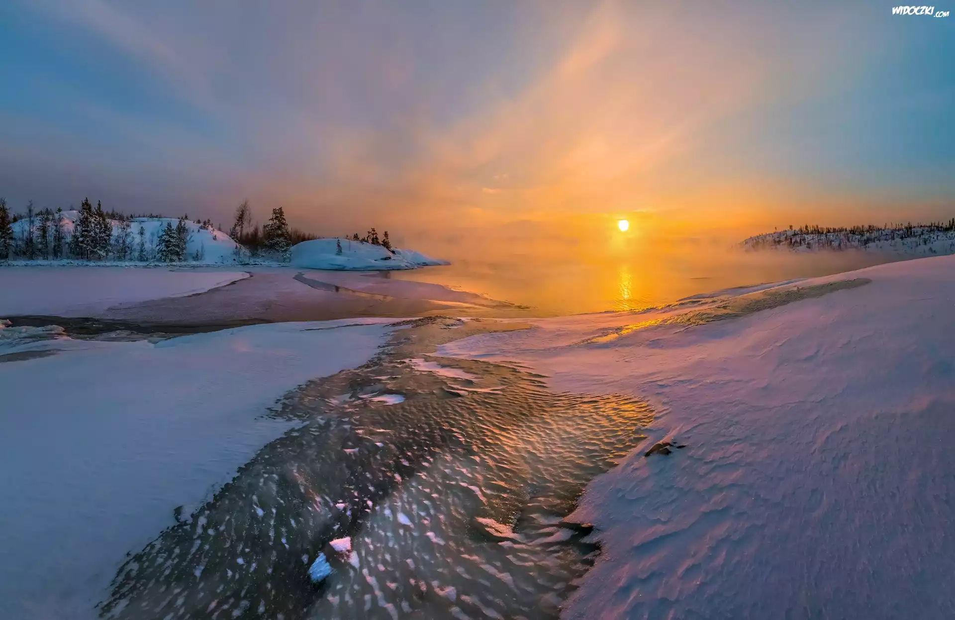 Zima, Jezioro Ładoga, Drzewa, Mgła, Wschód słońca, Karelia, Rosja