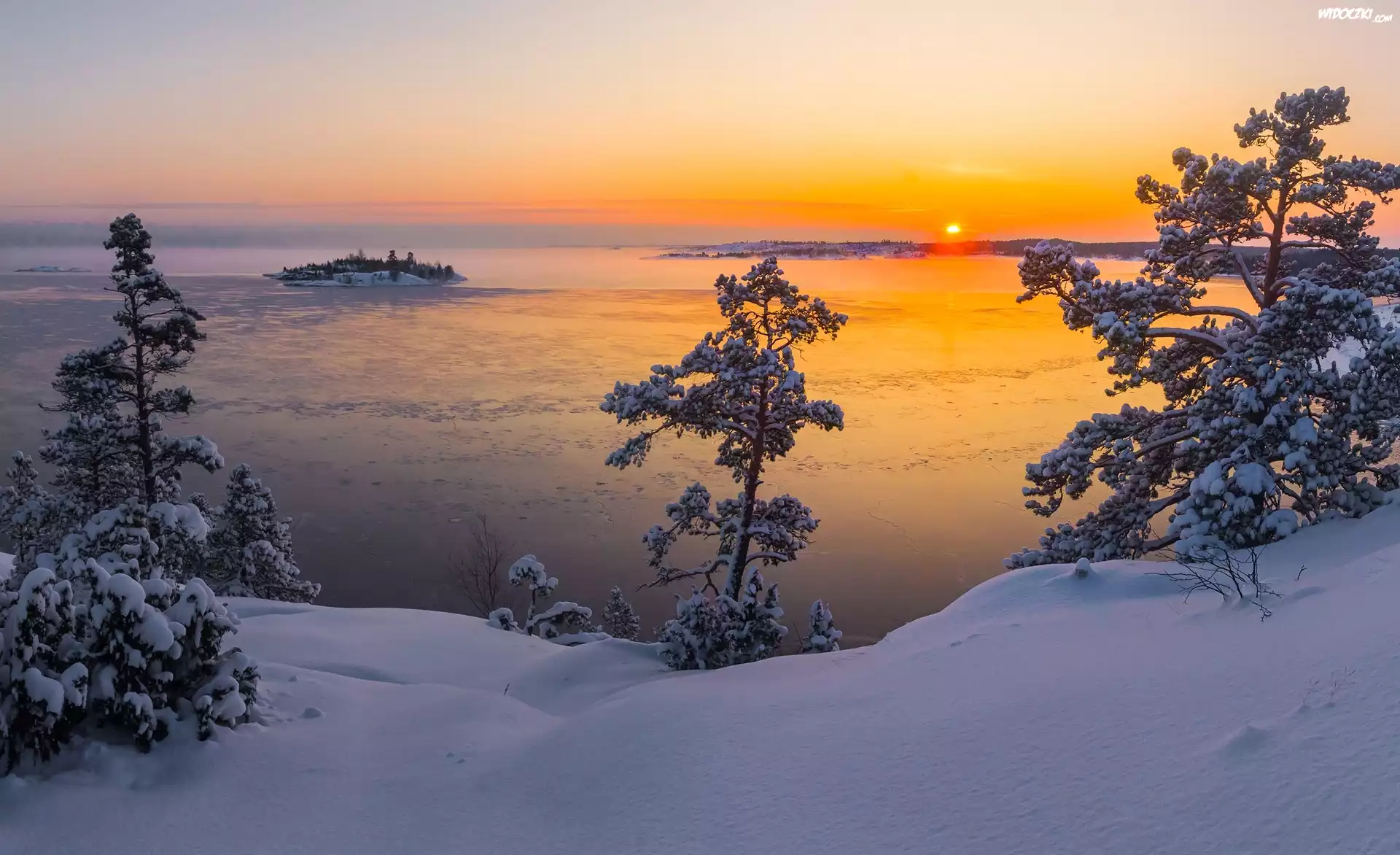 Wschód słońca, Zima, Jezioro Ładoga, Wyspa, Drzewa, Śnieg, Karelia, Rosja