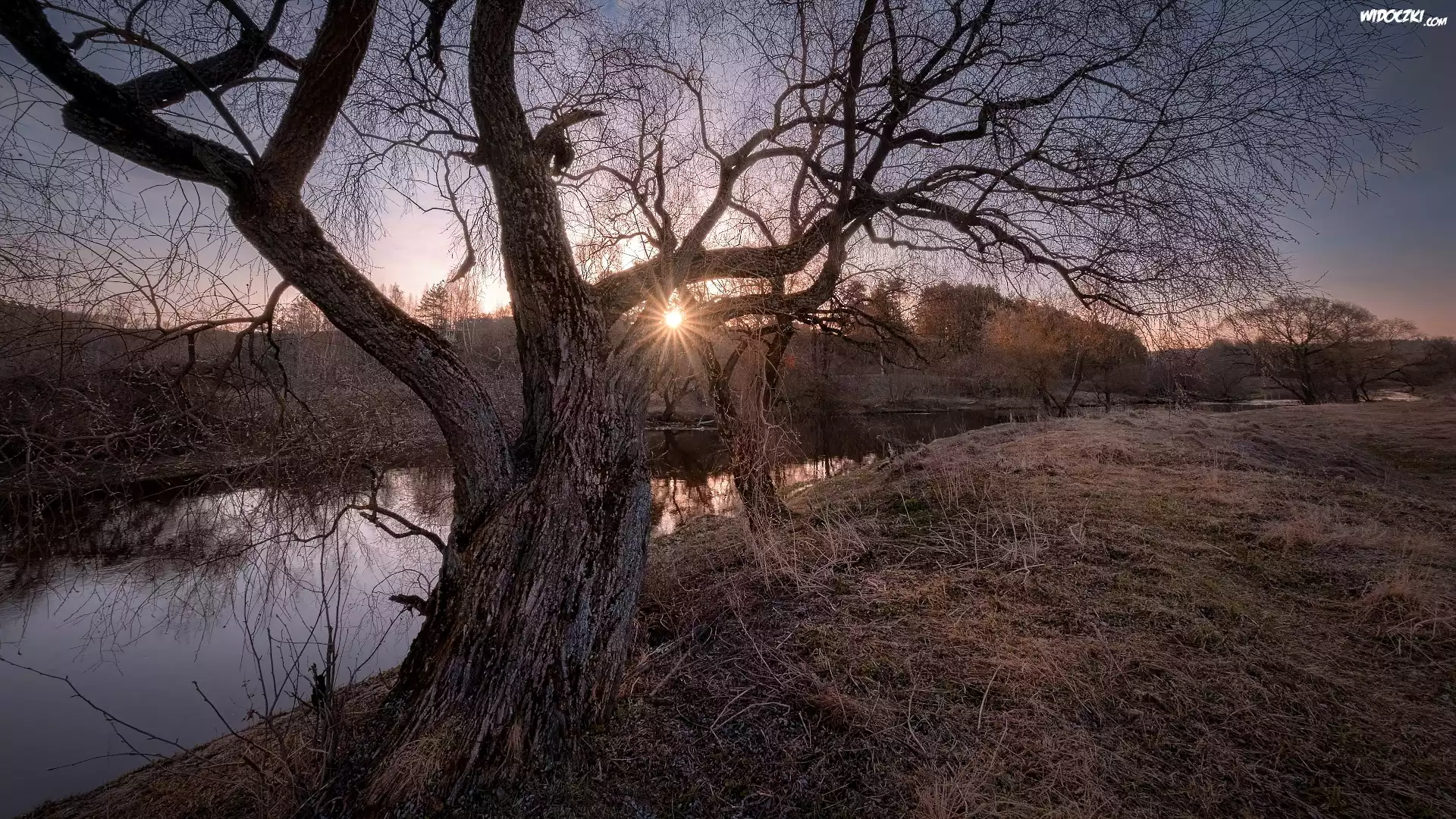 Zdjęcia, Wschód słońca, Rzeka Istra, Bezlistne, Drzewa, Trawa, Obwód moskiewski, Rosja