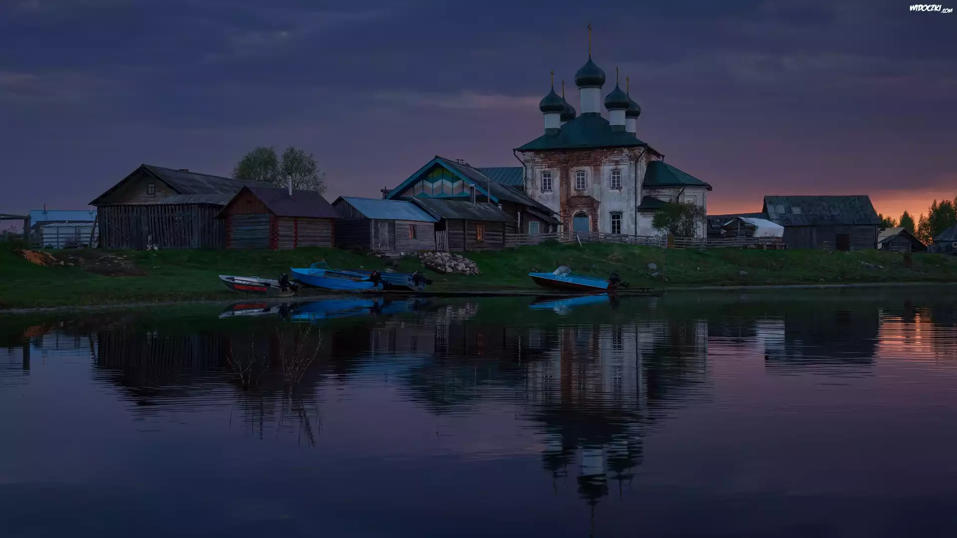 Zdjęcia, Rosja, Obwód Archangielski, Miejscowość, Kenozero, Rzeka, Budynki, Cerkiew, Wieczór