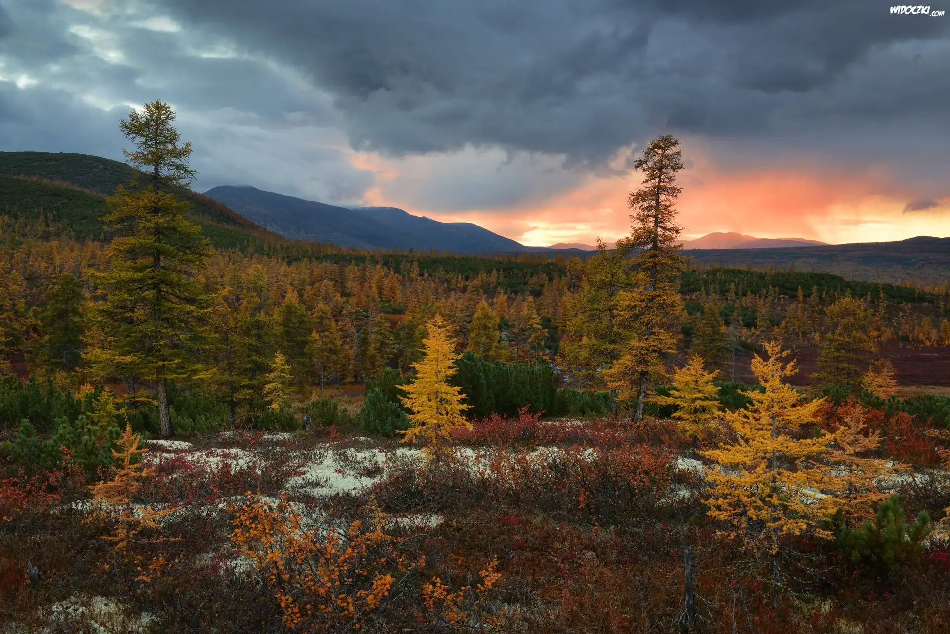 Zdjęcia, Góry, Wzgórza, Drzewa, Krzewy, Chmury, Jesień, Kołyma, Obwód magadański, Rosja