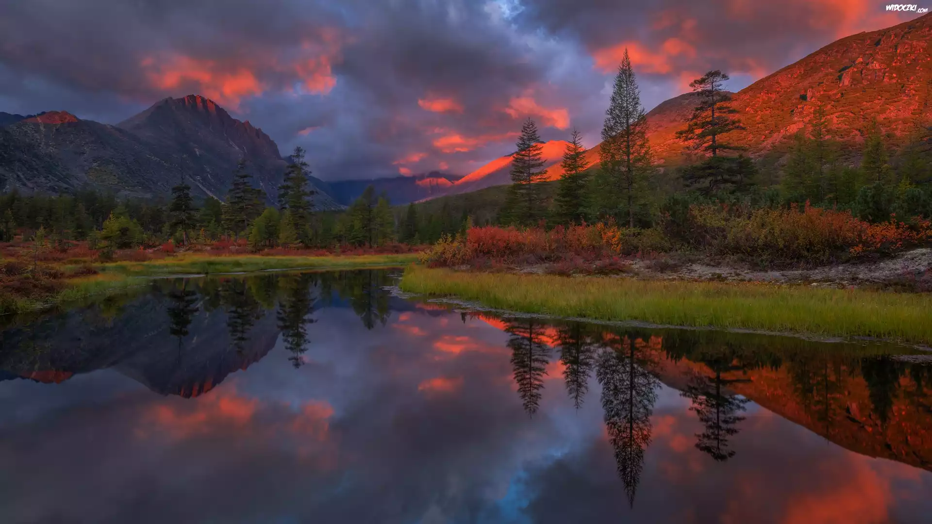 Rosja, Kołyma, Jezioro, Jacka Londona, Góry, Jesień, Drzewa, Chmury, Odbicie