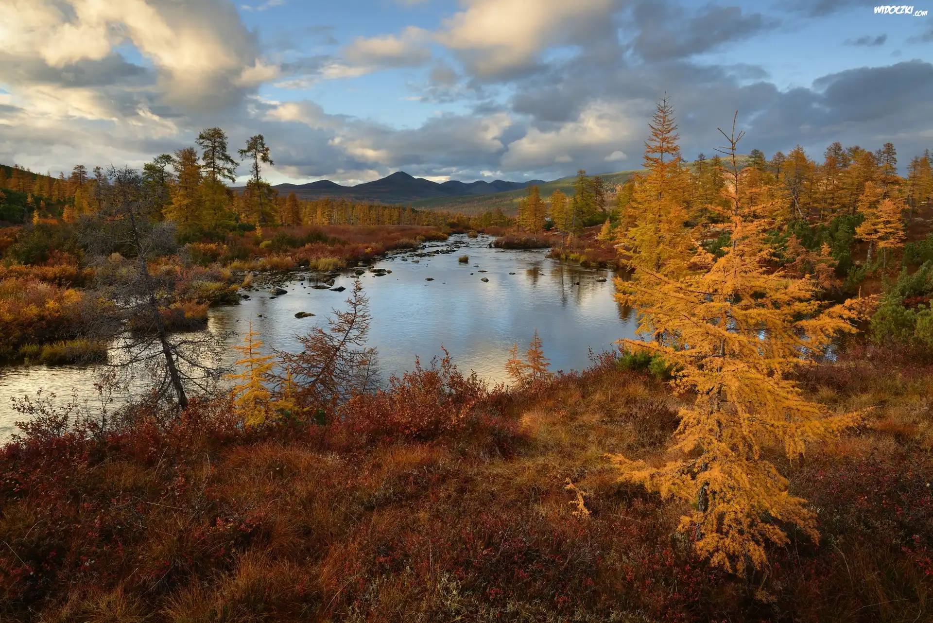 Zdjęcia, Góry, Rzeka Nevedomyy, Drzewa, Chmury, Jesień, Kołyma, Obwód magadański, Rosja