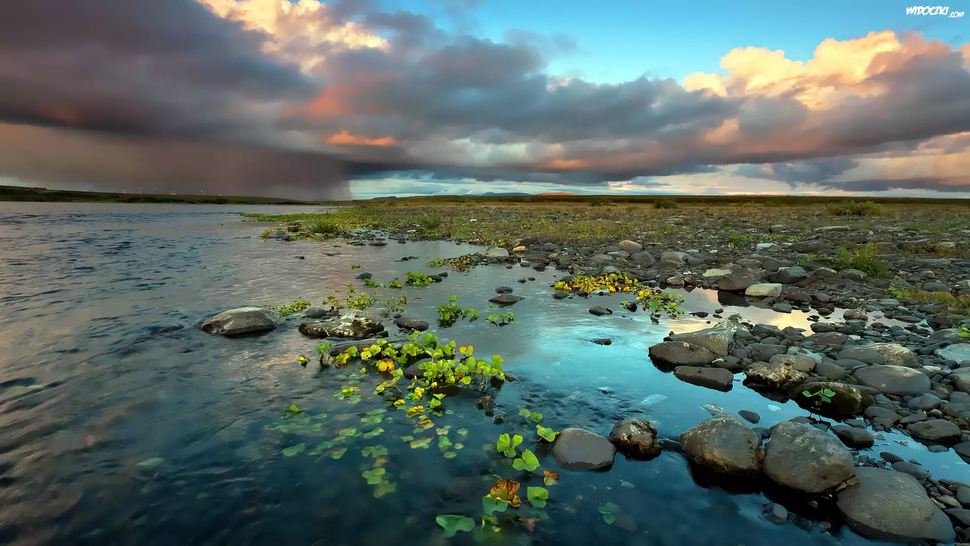 Rosja, Rzeka Usa, Kamienie, Chmury, Rośliny