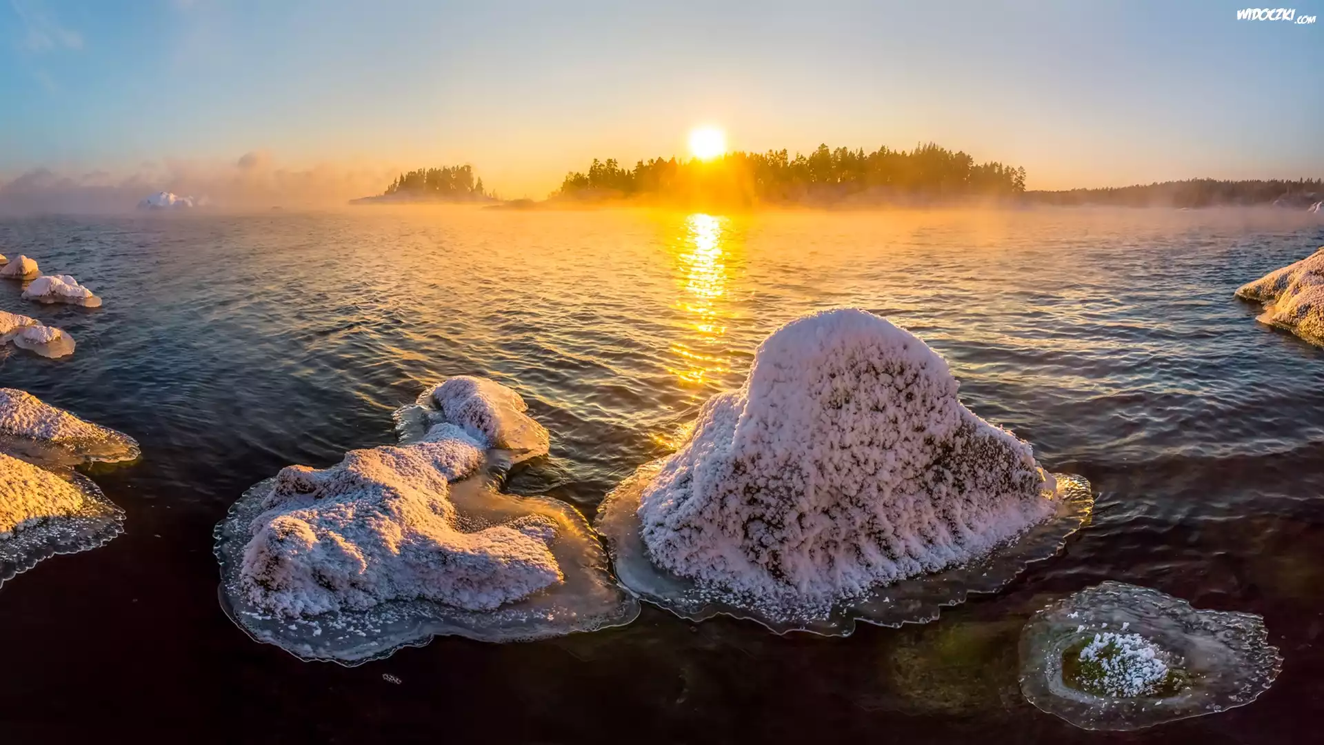 Zdjęcia, Jezioro Ładoga, Drzewa, Lód, Wschód słońca, Mgła, Karelia, Rosja